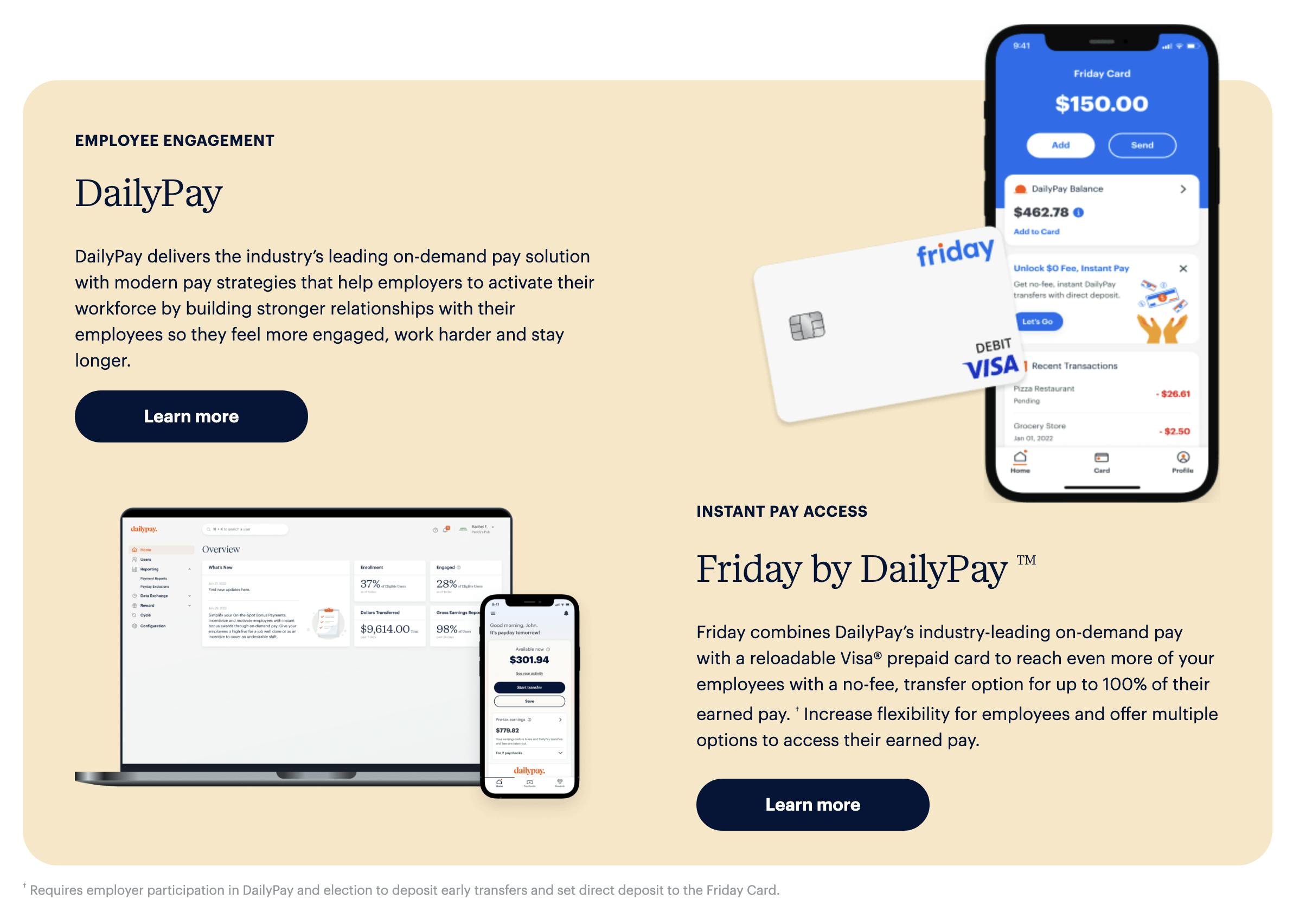 DailyPay’s primary product is a web-based platform and smartphone app that allows workers to collect unpaid wages before their scheduled pay period, a service commonly known as “earned wage access” (EWA). Employers partnering with DailyPay can make use of DailyPay’s 180+ payroll or timekeeping integrations to their existing workforce management software.