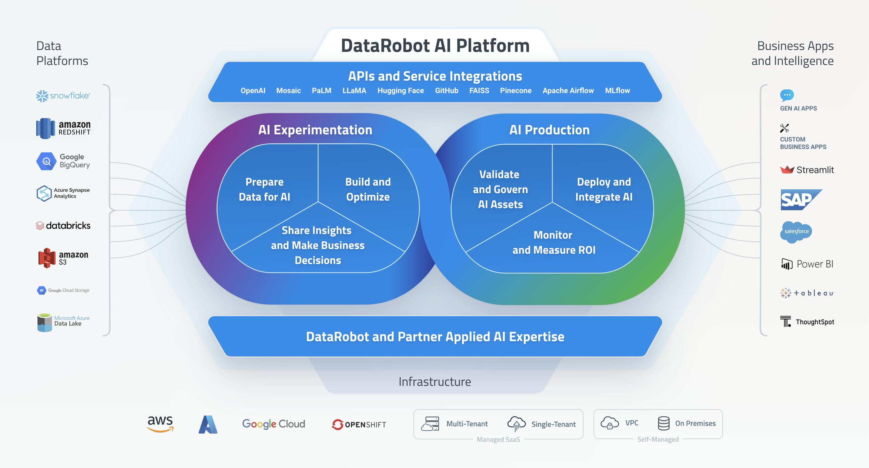 Platform Deployment: Integrations can unify data warehouses, APIs, workflow tooling, BI tools, and business apps with the DataRobot AI Platform with a flexible delivery model.