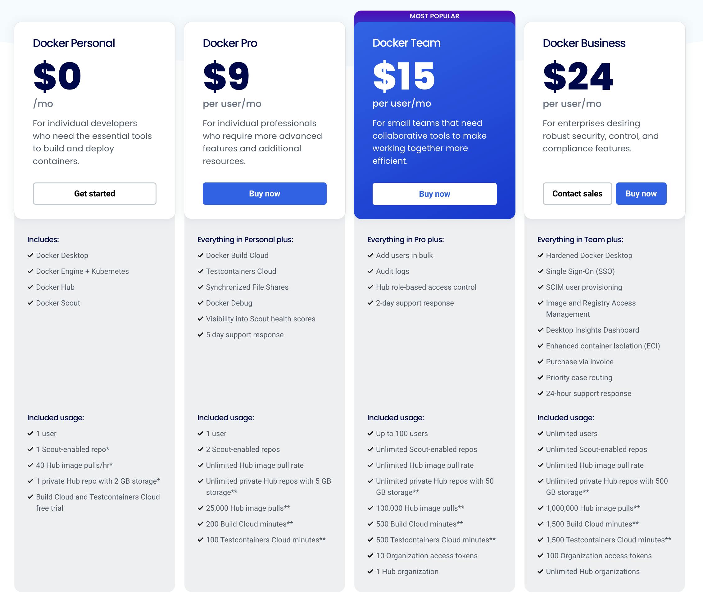 Docker Business: $24 per user per month. This plan targets larger enterprises requiring advanced security features, single sign-on (SSO), and compliance tools.