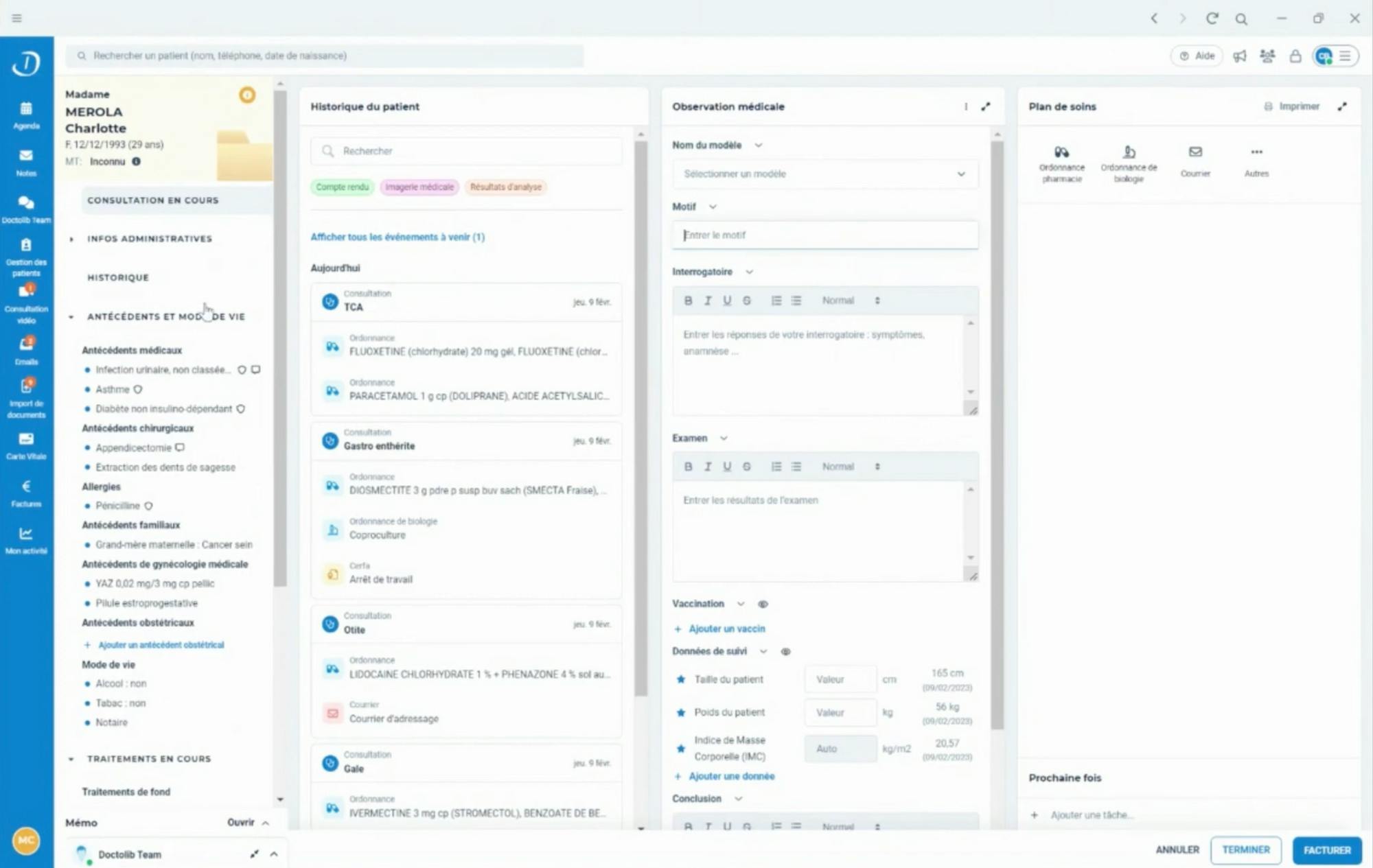Doctolib Médecin offers (1) patient management with the medical information and historical records about the patients, (2) document management to reduce manual entry or double entry, (3) consultation space to be more efficient while doctors treat patients, and (4) invoicing with automatic transmission to the French Social Security, which is a State organization that pays most medical costs.