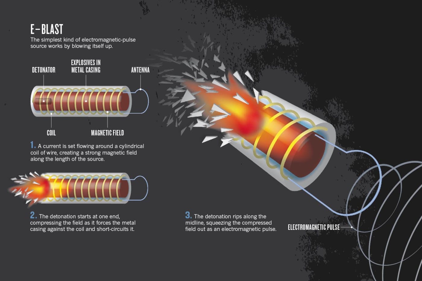By the early 2010s, a consensus had emerged that producing an HPM pulse powerful enough to disable electronics required more than conventional power sources like batteries. At the time, the solution was thought to be to detonate an explosive inside the HPM system itself, which would create a strong electromagnetic pulse by compressing a magnetic field generated along a cylindrical wire. As the explosive detonated, it would compress the magnetic field and the collapsing metal casing would short-circuit the coil, launching the compressed field as an EMP. However, deploying such explosive-based systems on aircraft and other mobile platforms was too risky, limiting the Air Force to pursuing HPM weapons designed primarily for single-use missiles.