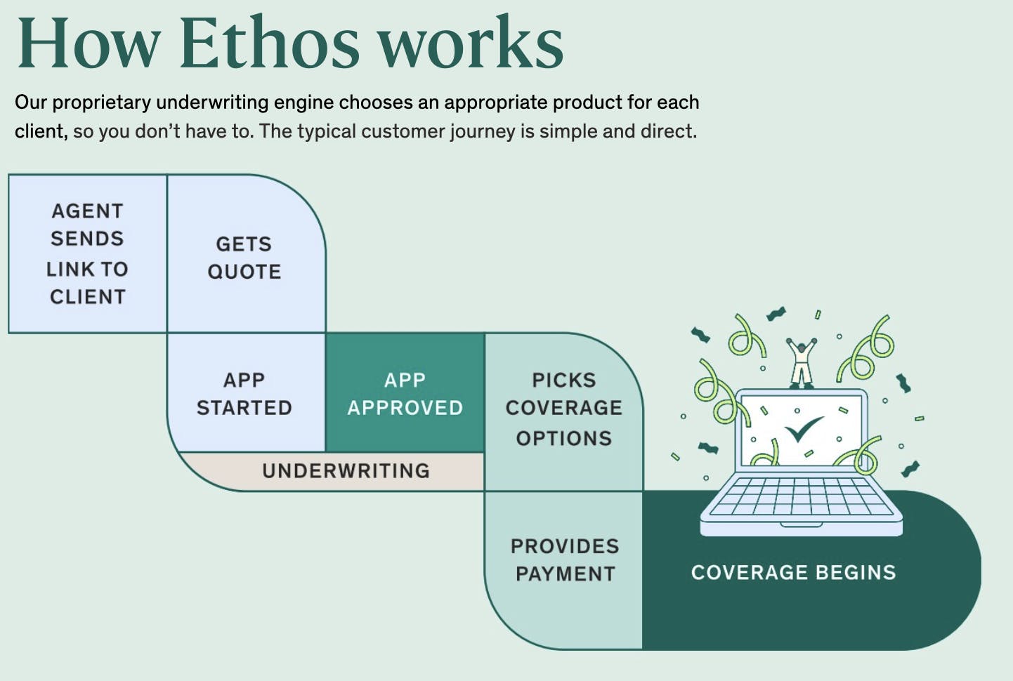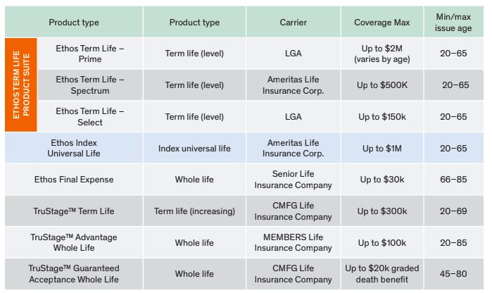 Ethos is a life insurance company that offers an online application process that prioritizes speed and ease of application. Its mission is “to protect the next million families”, and it describes itself as a “no-medical-exam, instant life insurance provider” that provides "life insurance in five minutes”. For consumers, the company provides life insurance policies designed to be accessible and affordable, leveraging data analytics to assess risk and expedite approvals through digitally-native underwriting. It also has an agent sales portal intended to serve as a turnkey solution for agents.