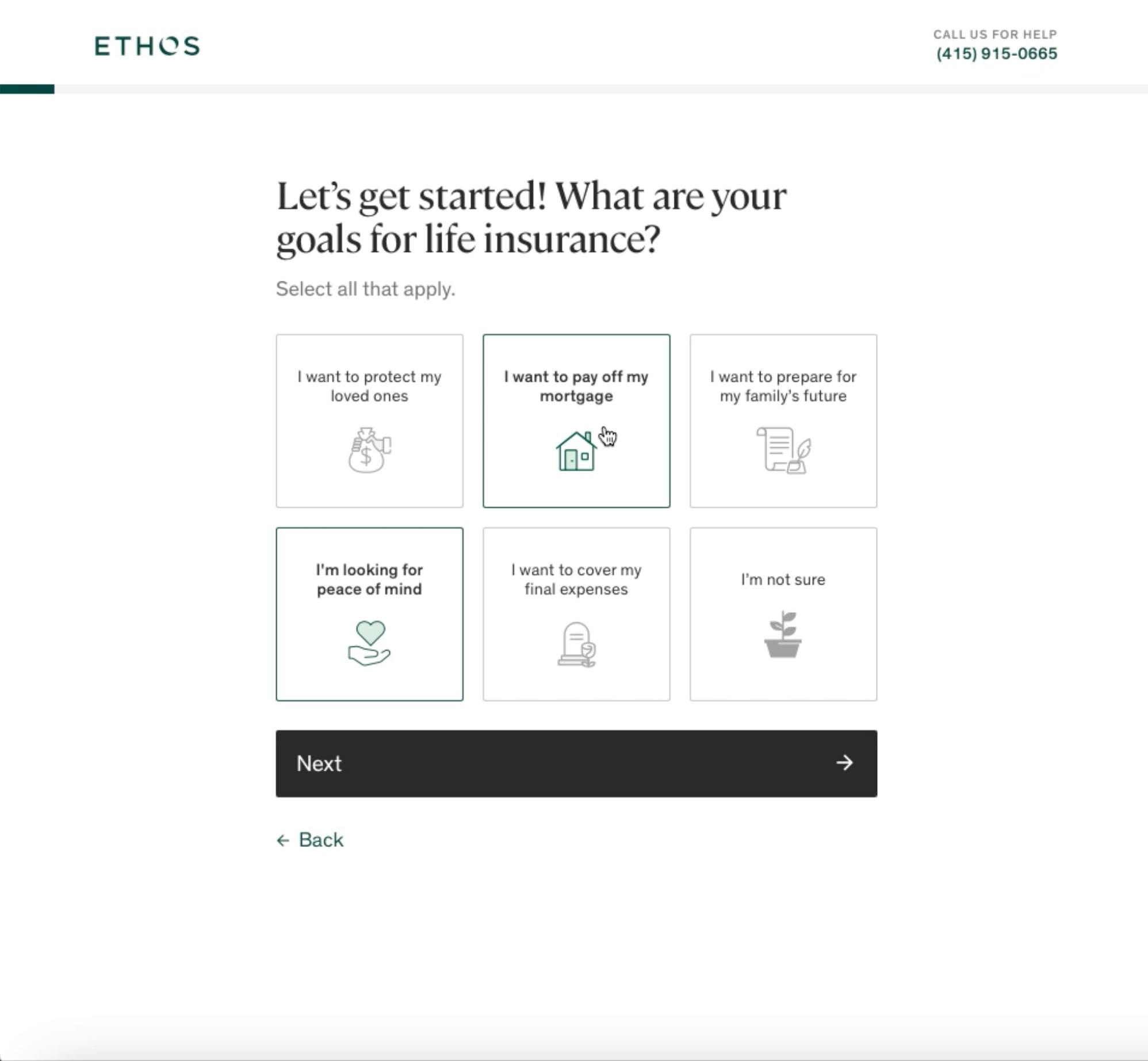 Based on the user’s responses, Ethos suggests an appropriate policy duration and coverage amount. Eligible applicants may receive policy approval on the same day.