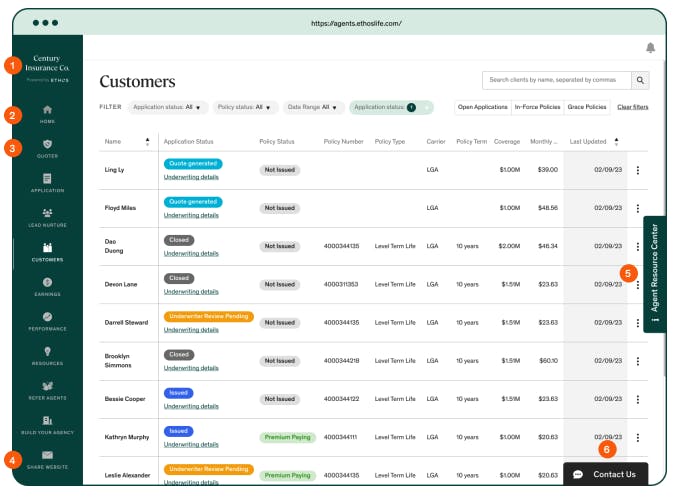 In addition to its online application for individuals and families, Ethos also provides tools for agents that accelerate their life insurance policy sales. These tools are wrapped under the Ethos sales portal, which operates as an all-in-one CRM for the agent. Agents can quickly send a client links (personalized with the agent’s company name) to apply and obtain quotes instantly. Agents can see the status of each policy, its underwriting details, and any relevant updates to the policy.