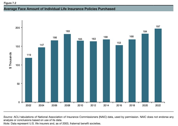 Even with this relative decline from its peak, life insurance remained a large market in the early 2020s. Individual life insurance, representing approximately 64% of all life insurance, had a face amount of $14 trillion in 2022, having grown 2.3% annually since 2012. The average size of an individual life policy grew at a 4.7% CAGR from $119K in 2002 to $297K in 2022.