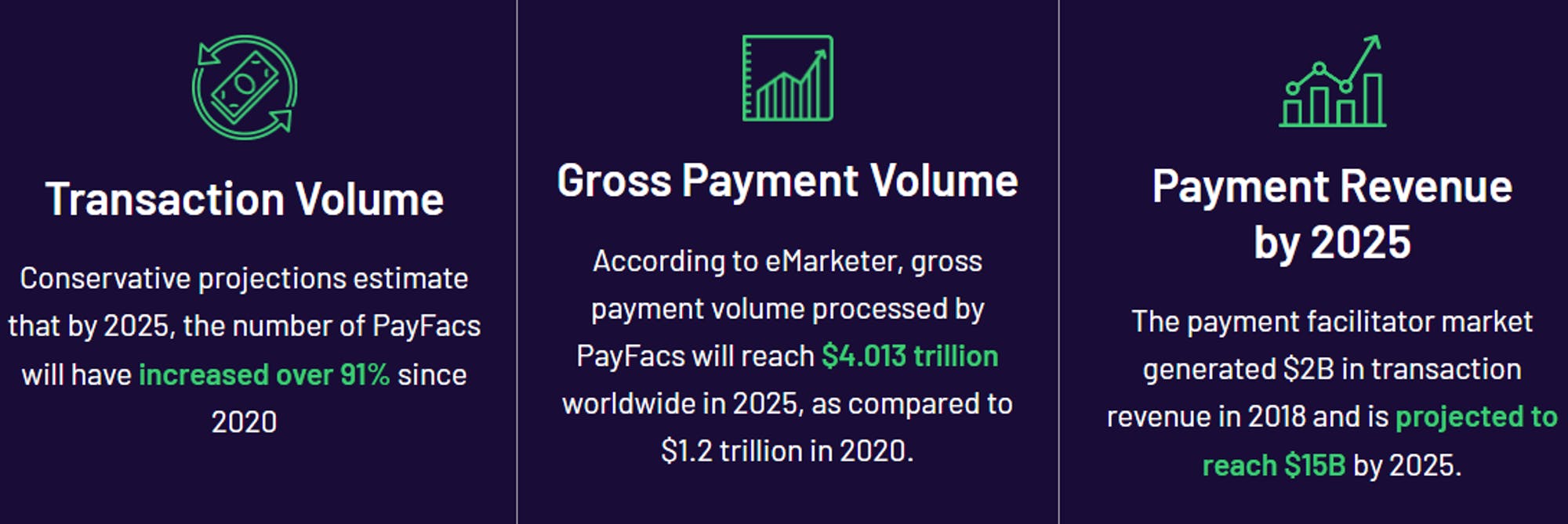 By 2021, the global payment industry revenues had recovered from the impact of the COVID-19 pandemic and grew by 11% to reach $2.1 trillion. Industry revenues are expected to continue growing for the next five years to exceed $3 trillion by 2026. In addition, the payment facilitator market is expected to reach $15 billion in payments revenue by 2025. As technology advances, businesses are opting to use modern PayFacs that provide a single solution that incorporates several functionalities.