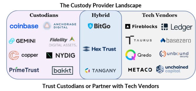 In financial systems, a custodian is a third party (e.g., a bank) holding and protecting the assets of individuals or other financial institutions. Although in crypto public blockchain ledgers store cryptocurrency assets themselves, custody providers still have a market to control and protect their clients’ “wallet keys” (e.g., account passwords). Several companies began modeling the financial system’s custody by taking on the liability of storing the keys and the number of assets they covered. Such custodians utilized variations of wallets with different methods of security and speed.