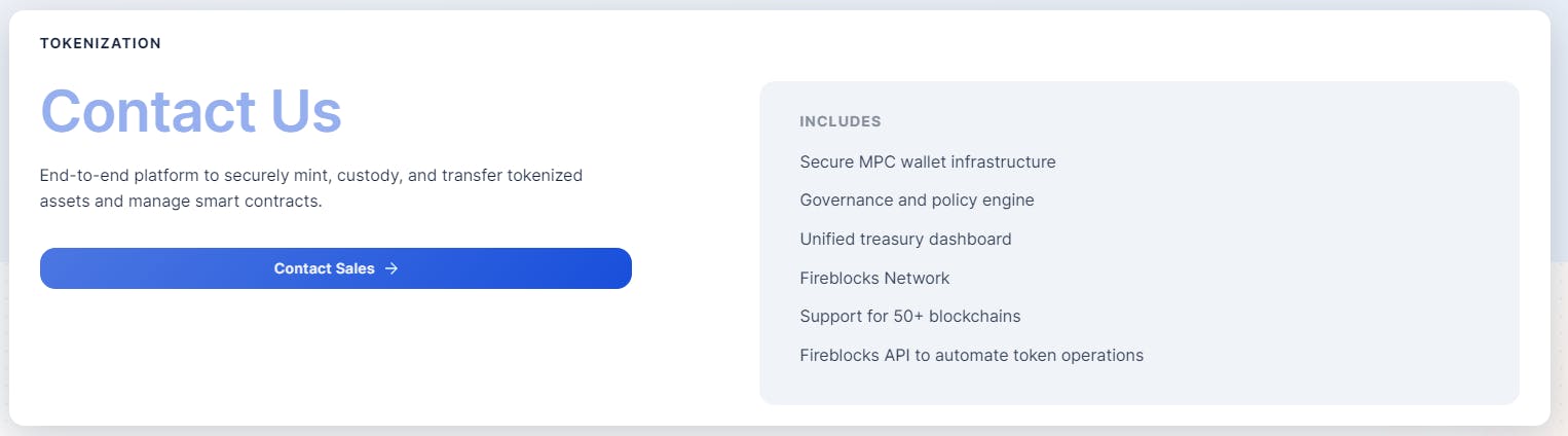 As of September 2023, Fireblocks does not publicly disclose its pricing for the tokenization product. However, the base package includes secure MPC wallet infrastructure, a governance/policy engine, a unified treasury dashboard, access to the Fireblocks network, support for over 50 blockchains, and the Fireblocks API.