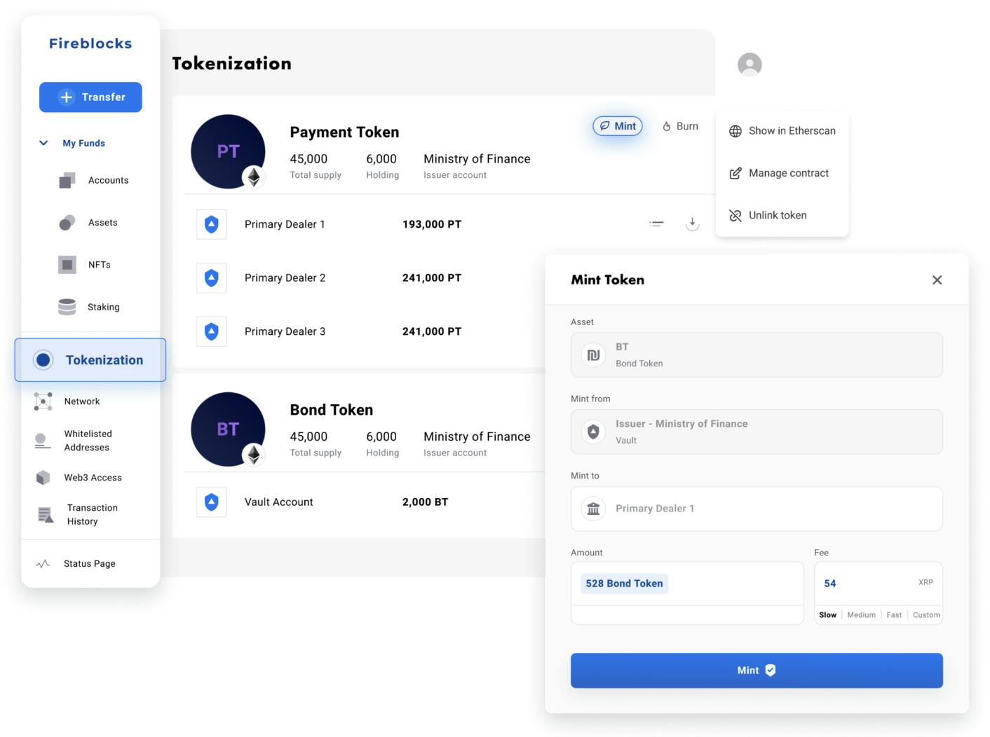 In cryptocurrency, tokenization is the process of issuing a new blockchain asset. Fireblocks’s tokenization product is a solution that enables clients to mint, custody, and transfer tokens. It can also be used to manage smart contracts. Further, the product allows users to connect to a network of market participations to distribute the assets. Fireblocks supports multiple assets, including public and private securities, stablecoins, carbon credits, and CBDCs.