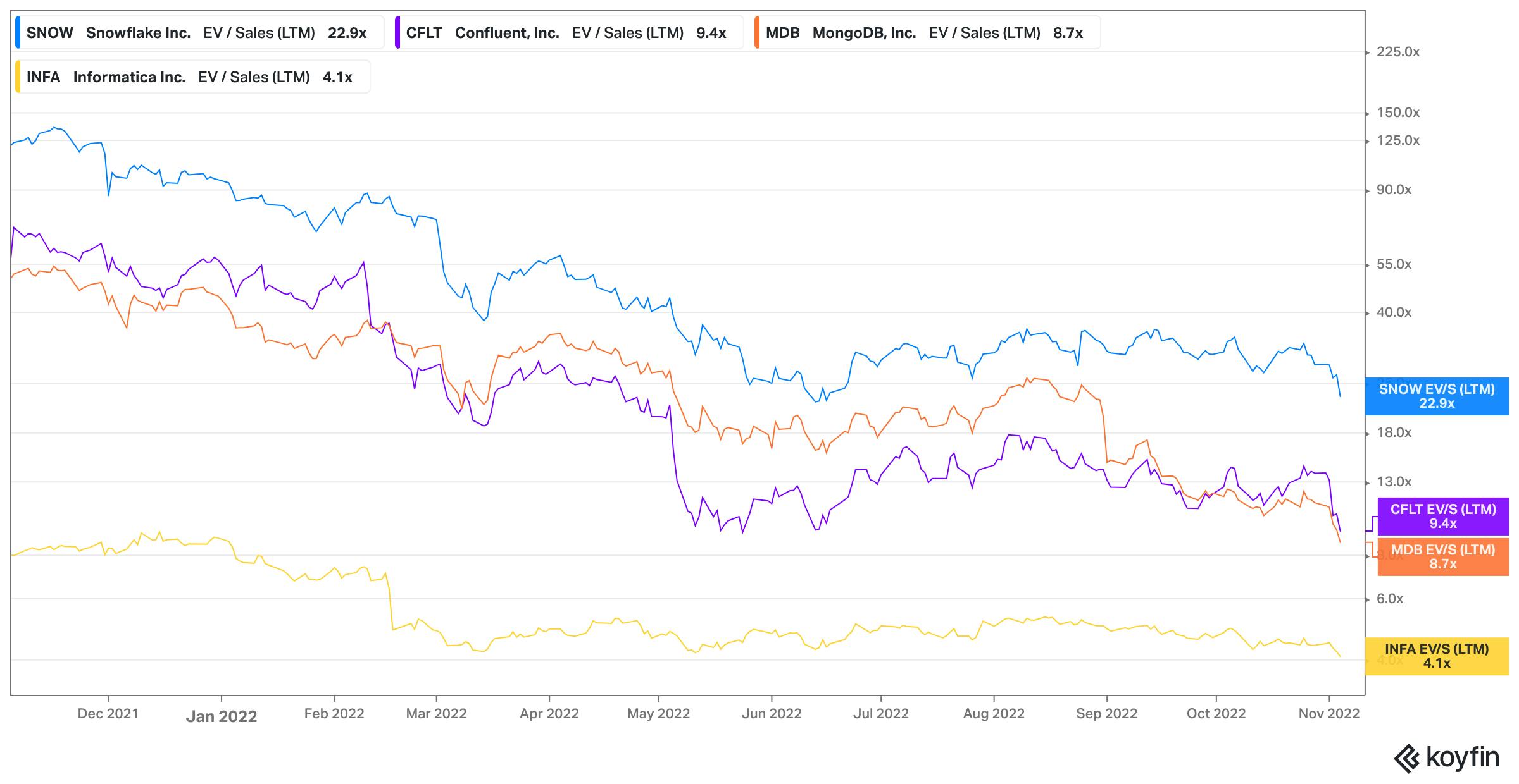 Comparable high-growth data software companies like Snowflake, MongoDB, and Confluent have also all seen their revenue multiples sharply compress from the highs of November 2021 and trade at a deep discount to Fivetran.