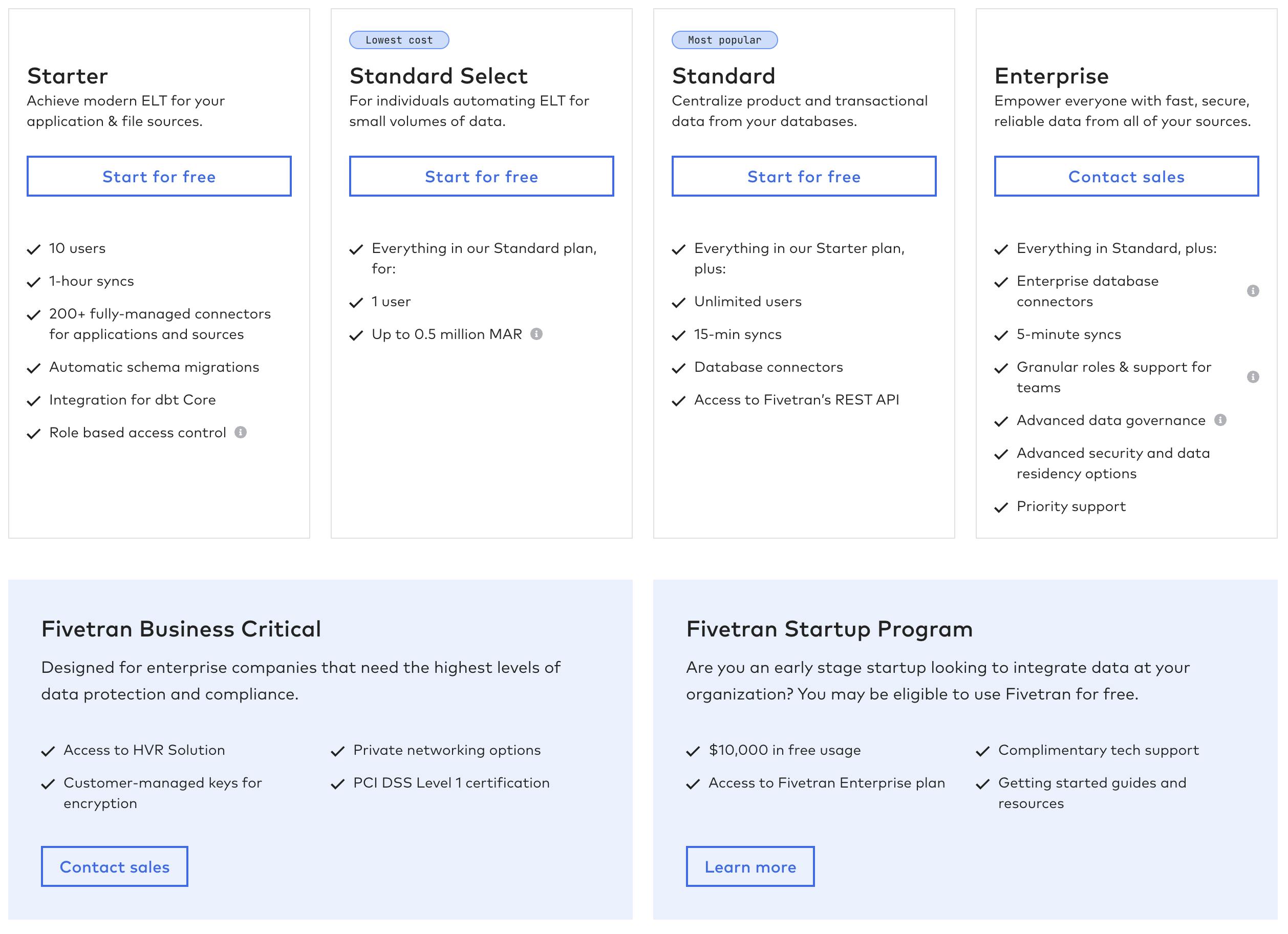 Fivetran employs a consumption-based pricing model which it transitioned to in February 2020. In this model, customers are only charged for the amount of data extracted and loaded, based on the number of monthly active rows. The cost per row decreases as monthly consumption increases. Customers are offered a 14-day free trial before charging for usage. The company has 4 pricing plans: Starter, Standard, Enterprise, and Business Critical.