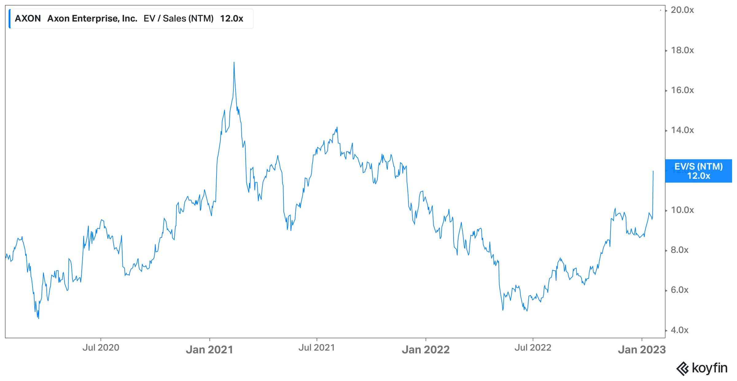 In February 2022, Flock Safety raised a $150 million Series E led by Tiger Global at a $3.5 billion valuation. Based on our estimates of the companies revenue at ~48-96 million ARR as of early 2023, that $3.5 billion valuation would represent a range of 36-73x ARR multiple for Flock Safety. Axon Enterprise is a similar company to Flock Safety, focusing on public safety, selling to police departments, and containing a similar subscription business model. As of January 2023, Axon is trading at ~12x NTM revenue after dropping from an early 2021 peak of ~18x NTM revenue.