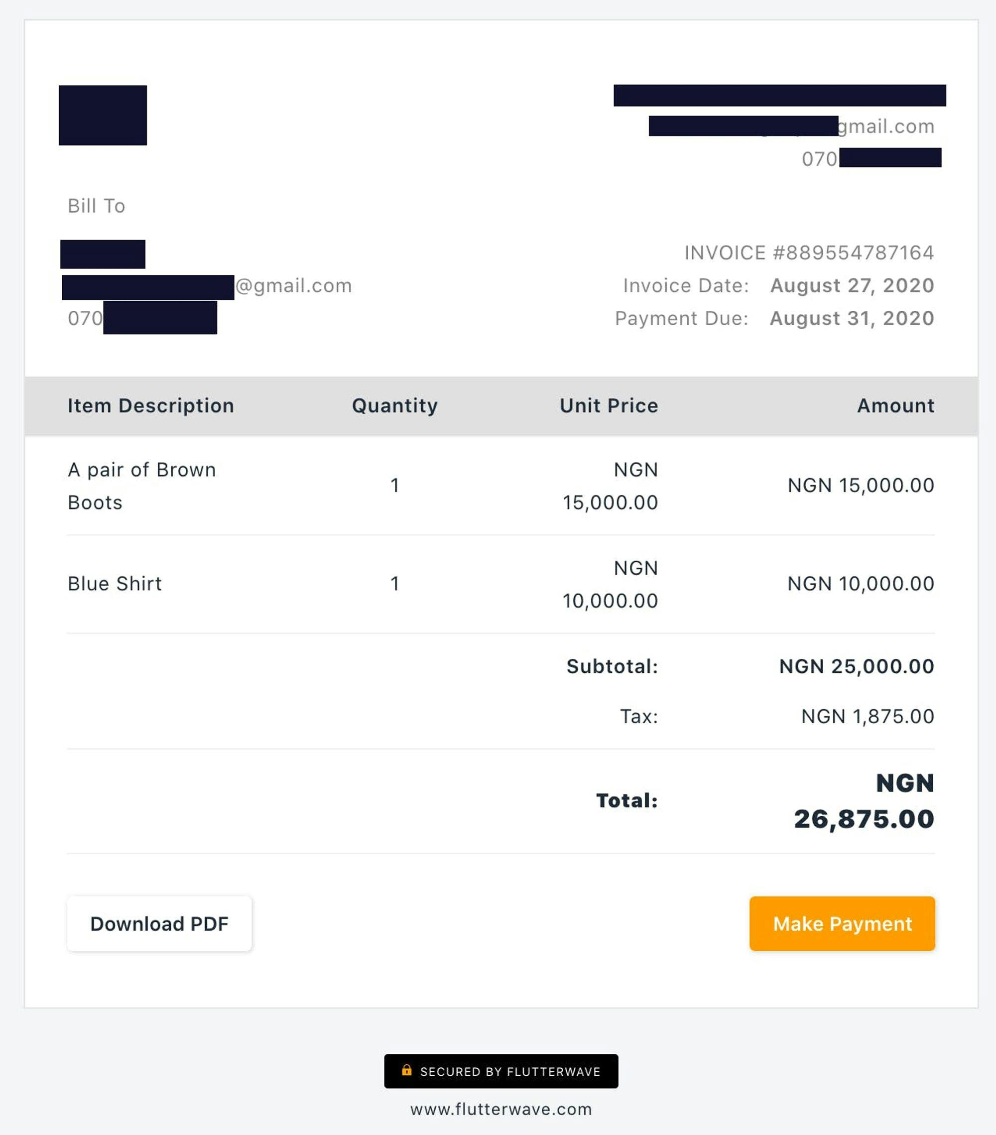 Flutterwave Invoices is an invoicing solution with a secure payment option. It enables the creation of digital invoices that contain all the necessary information a customer needs. With this digital invoice, customers can pay directly from the email they receive the invoice.