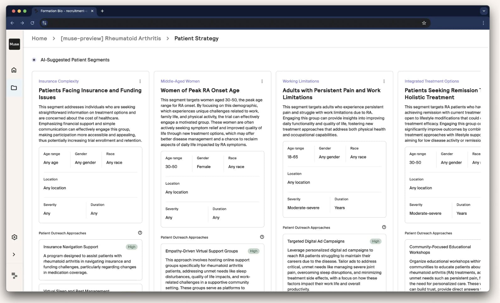 A key component of this system is Muse, Formation Bio’s generative AI tool for patient recruitment. Built on OpenAI’s Assistants API, Muse transforms a small set of trial documents into tailored materials, including pre-screening questionnaires, digital ads, and outreach content. It synthesizes scientific literature, real-world data, and competitive insights to identify ideal patient populations and recommend recruitment strategies. Muse supports real-time editing through conversational interfaces and automates compliance checks, enabling teams to quickly tailor content across demographics, languages, and outreach channels.