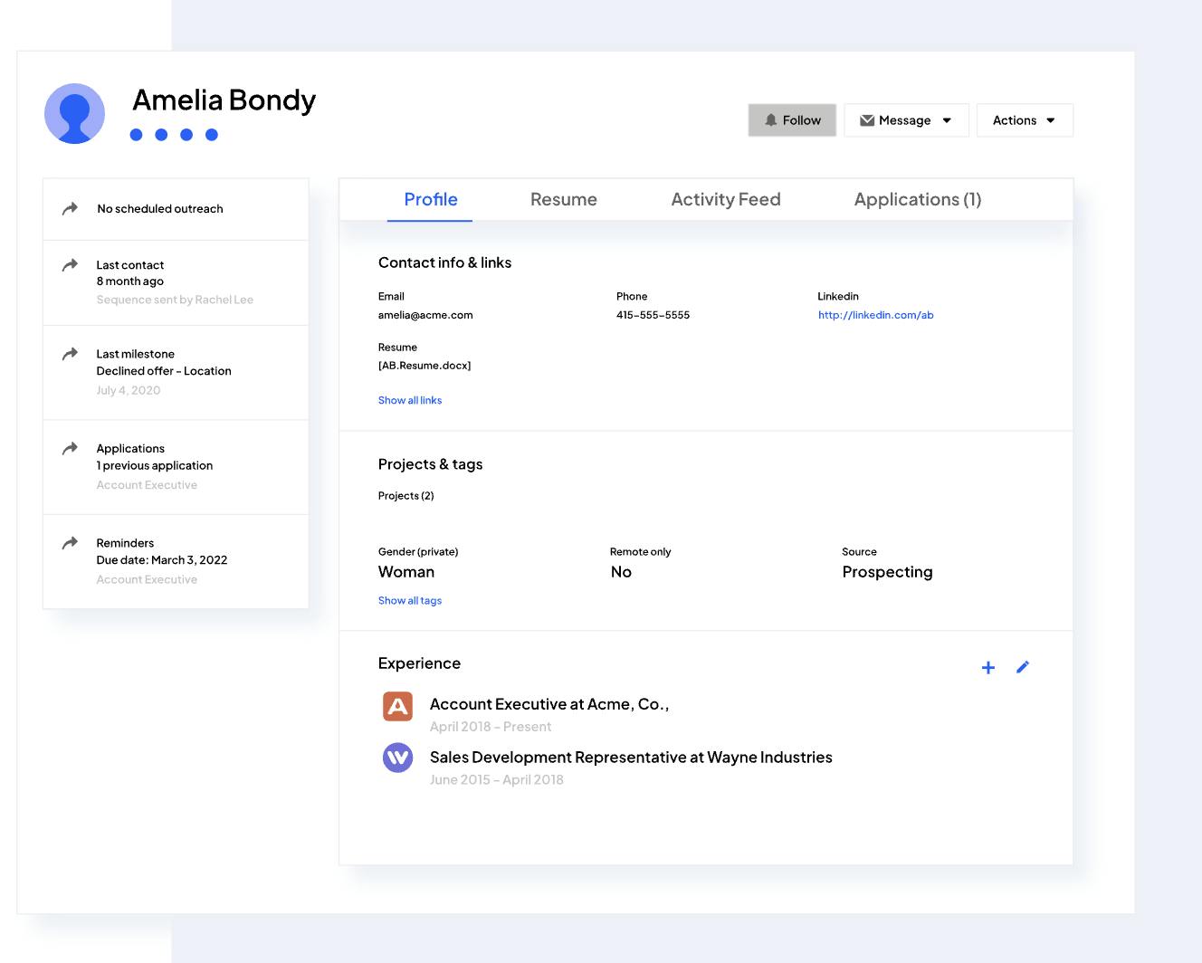 Within Gem’s CRM, each candidate profile has a list of past interactions, relevant skills, career updates, previous job applications, and personal information, giving recruiters context regarding their relationship with the applicant. Data from any of the applicant tracking systems or Gem’s other tools is automatically synced with Gem’s CRM, allowing recruiters to both capture and retrieve data on demand. Recruiters can search within Gem’s CRM to engage and re-engage with candidates and track their career trajectory across job changes and other milestones.