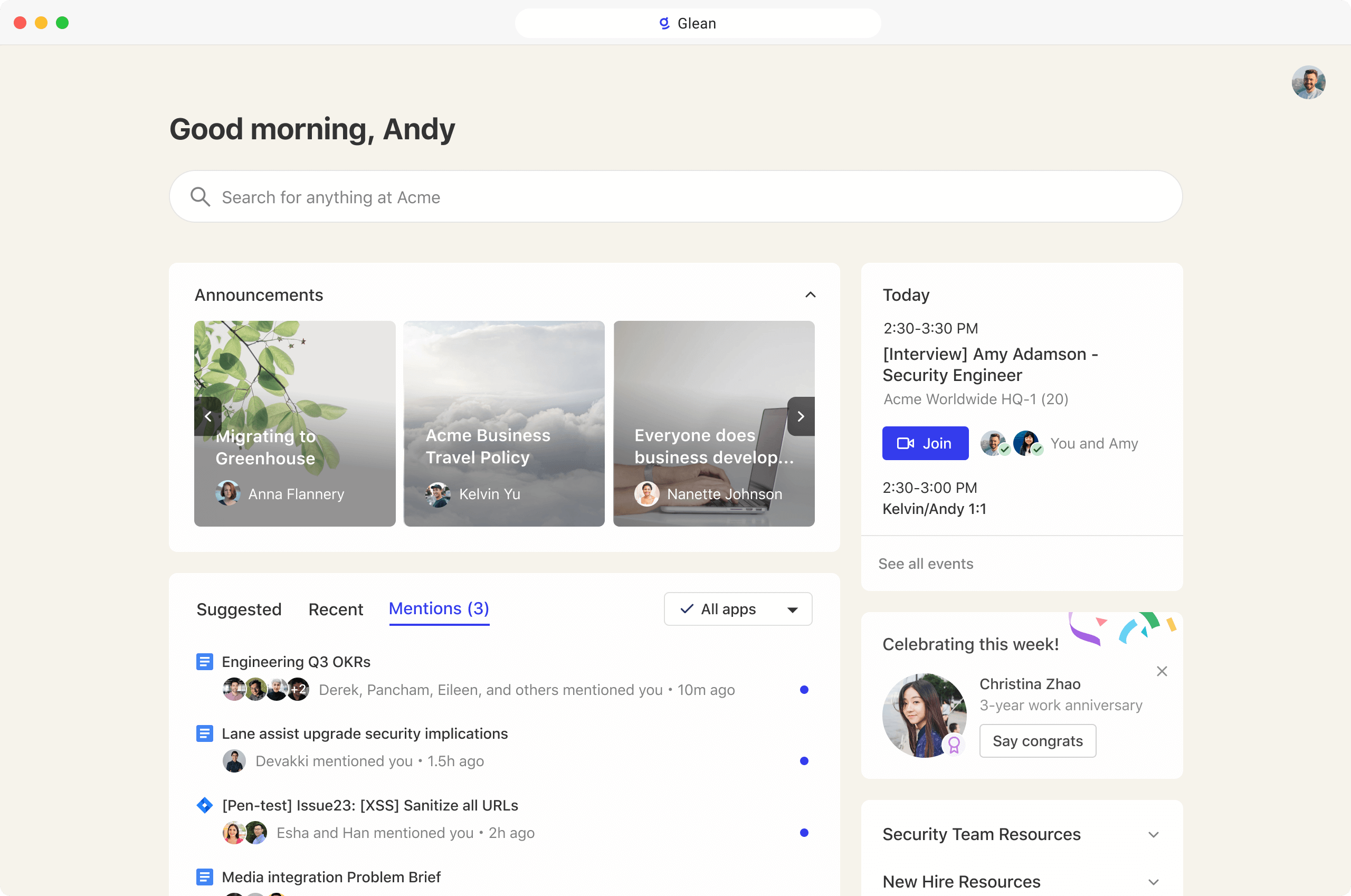 Glean has built out a “home page” that serves as the go-to spot for employees to find AI-generated recommendations for documents to read through or people with relevant knowledge. This home page includes company announcements, employee directories, a calendar, and multiple widgets to help supercharge employee collaboration like related people, recent work, and availability to meet.