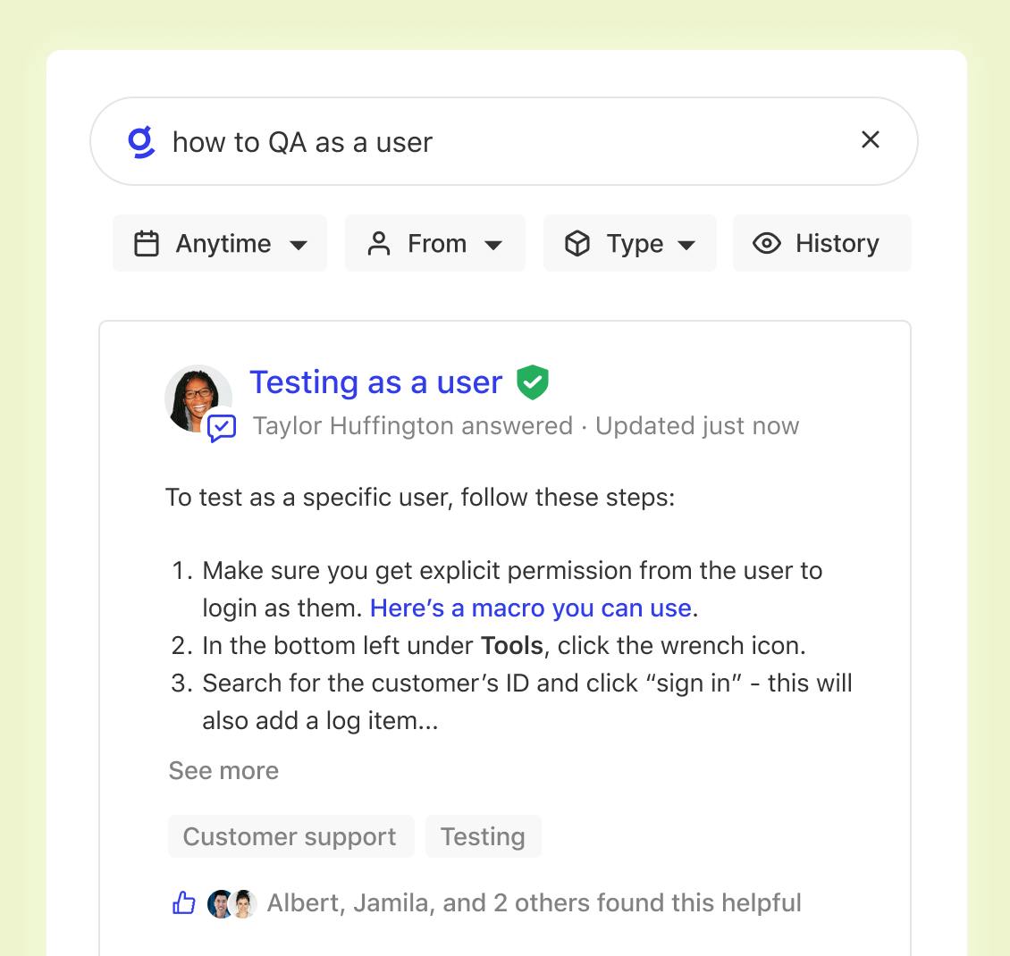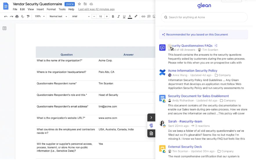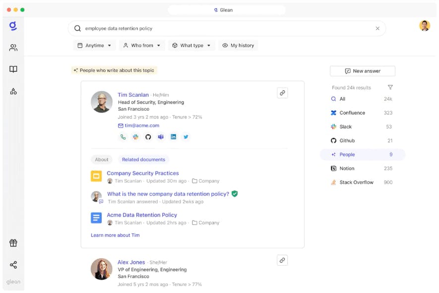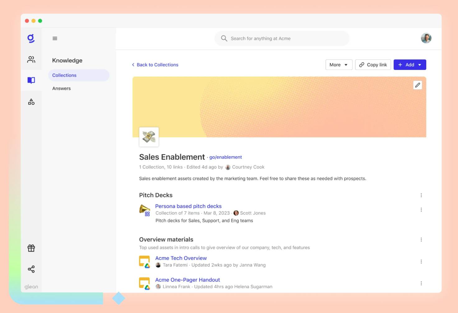 With Glean’s Knowledge Management product, users can compile and organize a set of links and documents from disparate platforms into a unified collection. This enables employees to conveniently locate a collection of resources that otherwise would have required manually visiting each respective platform such as Google Slides, Atlassian, or Salesforce, to find desired documents.
