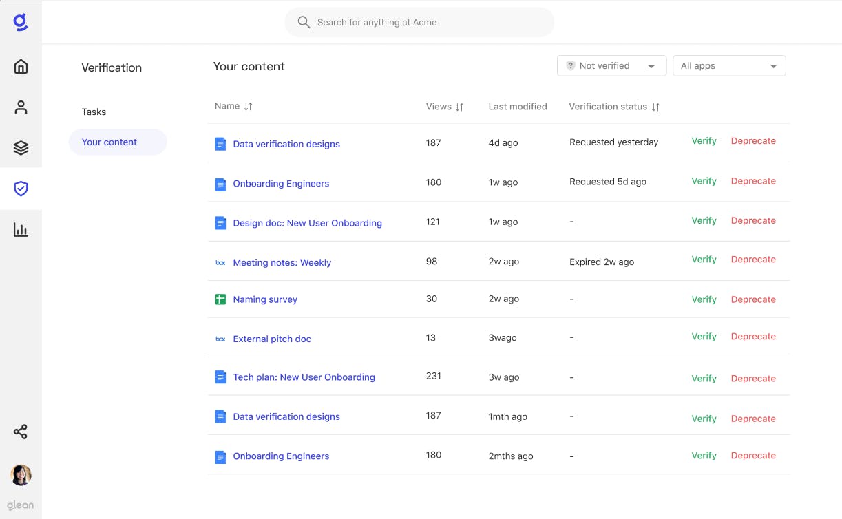 Users also “own” documents or resources that they’ve created. They can see all documents that they have ownership status of in a unified interface. Additionally, the user can verify that a given document is up-to-date. When a document is verified by its owner a green check mark is shown to the right of the document name in the search results page.