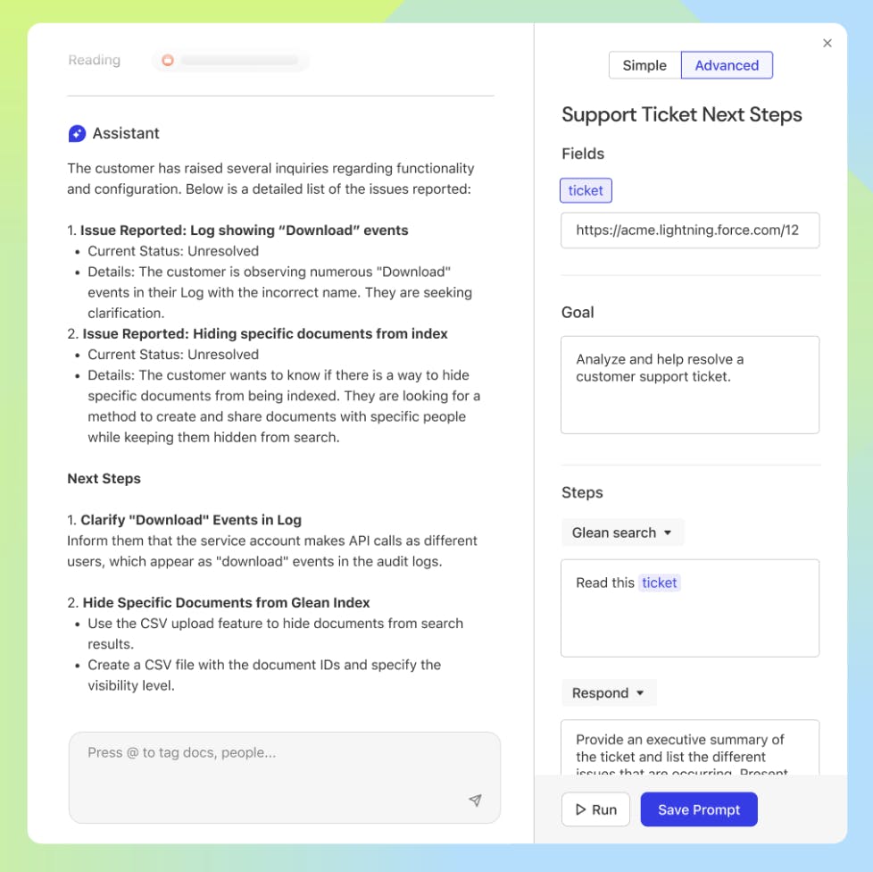 With Prompt Builder, users can more easily create simple and complex prompts. A simple prompt “performs single retrieval actions”, such as searching for documents and returning relevant text snippets or drafting content. However, advanced prompts require multiple steps. Users can now build multi-step prompts in a user-friendly interface with zero code. For example, a user in customer support can simply paste a link to a support ticket, specify the objective of the prompt, and specify the multiple steps that should be taken. In this example, the specified ticket will be read and an executive summary of the ticket will be generated.