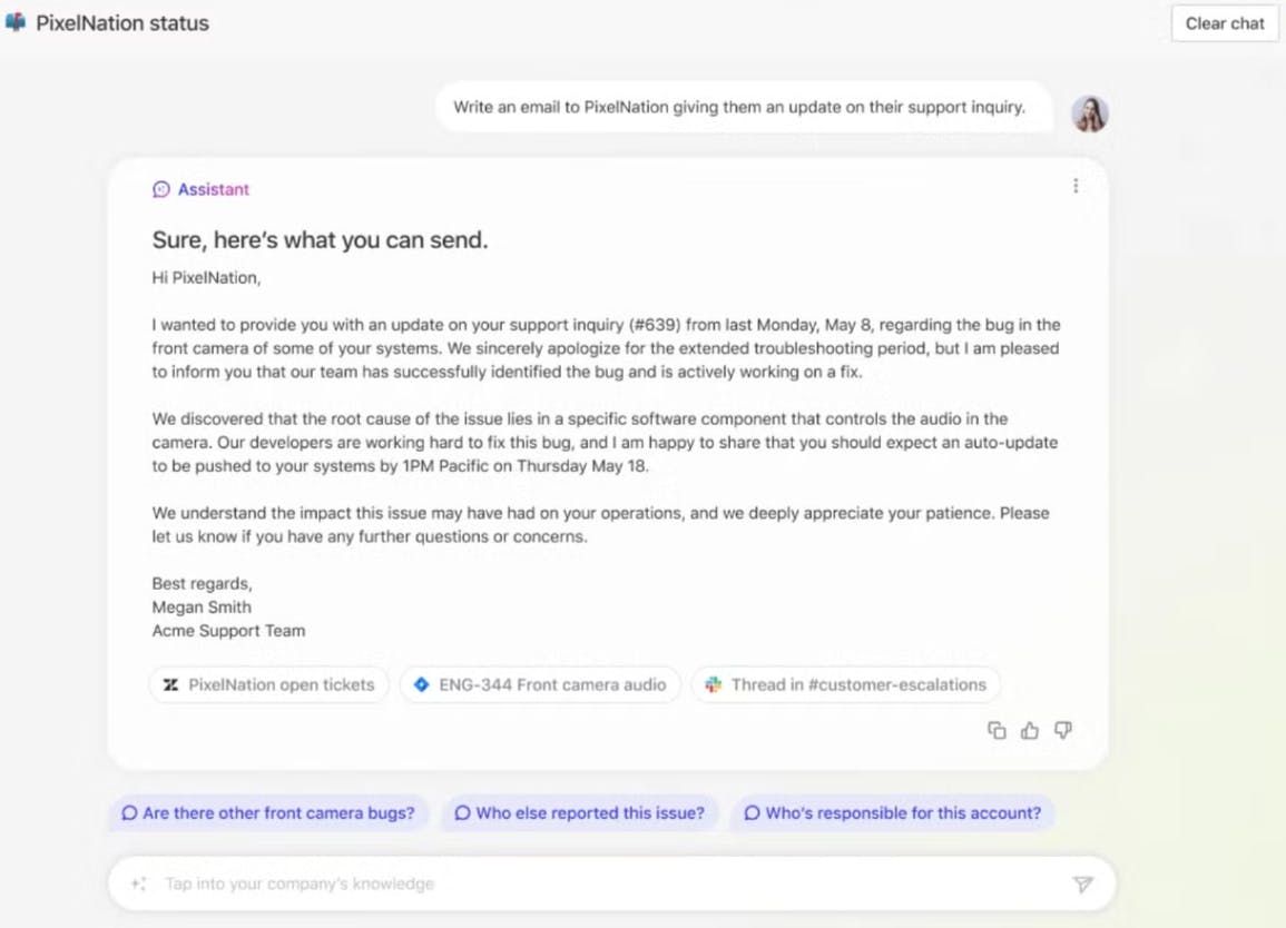 After the user submits a query in natural language the chatbot pulls contextually relevant information from documents contained in applications within the enterprise’s knowledge base. It then incorporates pertinent information into its response. For example, a user can ask Glean Chat to write an email to a customer based on information sourced from their submitted ticket that resides within Zendesk.