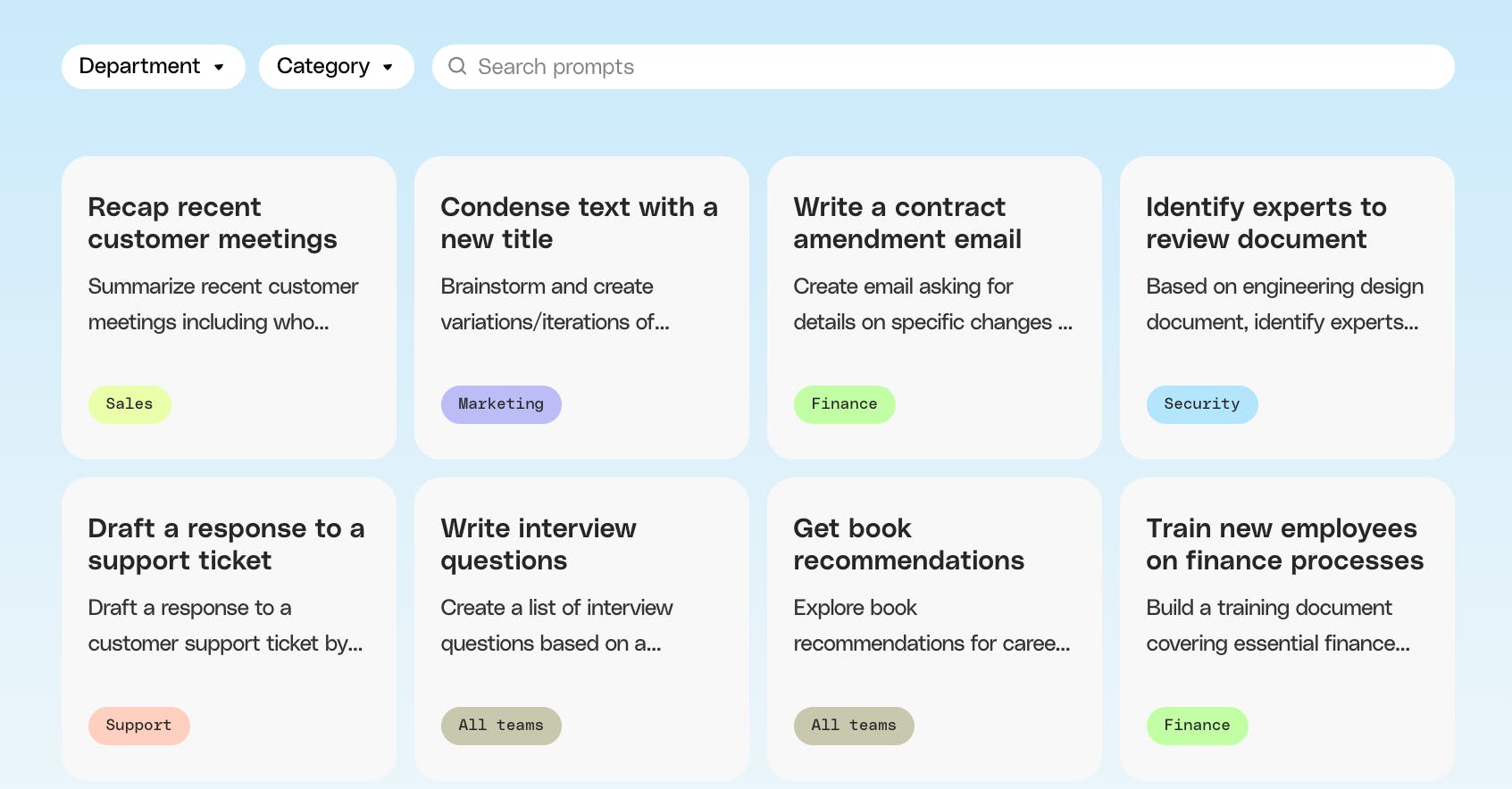 Also released in September 2024 was Prompt Library, an offering viewable by a customer’s entire organization. It enables prompts to be “readily distributed, experimented with, and discovered by everyone.” This eliminates the need for users to manually produce their own prompts, as they can now utilize those already completed by coworkers. Users can filter prompts by department (e.g. marketing, engineering, design, product, IT, etc.) and category (e.g. search, create, summarize, analyze, onboard, explore, and research).