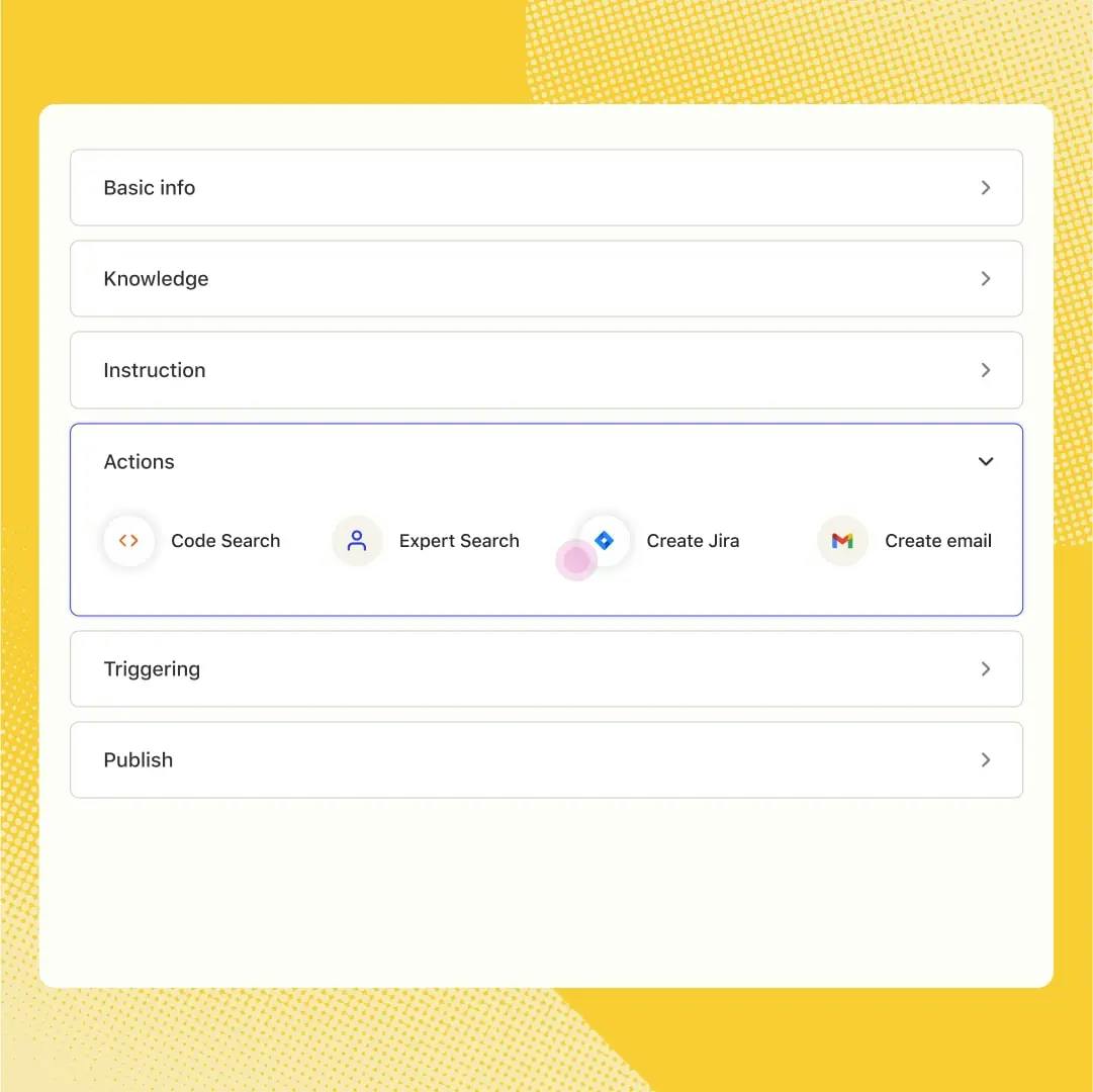 After that, the user can specify the “actions the app can take on a user’s behalf within a company’s connected applications” such as building code in Jira or creating an email. Lastly, access permission is determined by either an individual or by a team. The trigger that initiates the app’s steps is also provided.