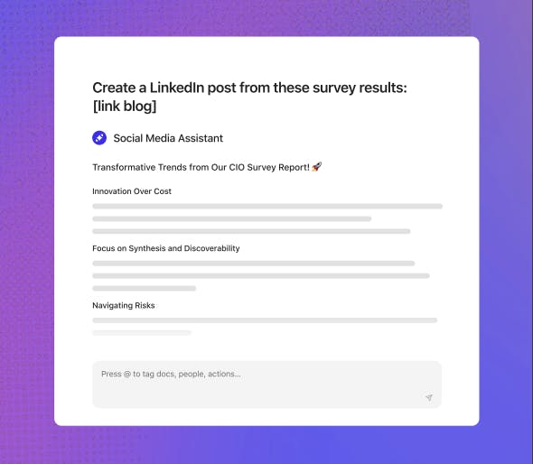 For example, a marketer can create an app that produces LinkedIn post copy based on an uploaded document. The output can follow a desired tone of voice based on the instructions specified by the user. Once the user approves of the copy, Glean Actions takes over and publishes the post directly to LinkedIn. The app can be reused with different documents, drastically reducing the time required for the marketer to produce LinkedIn posts.
