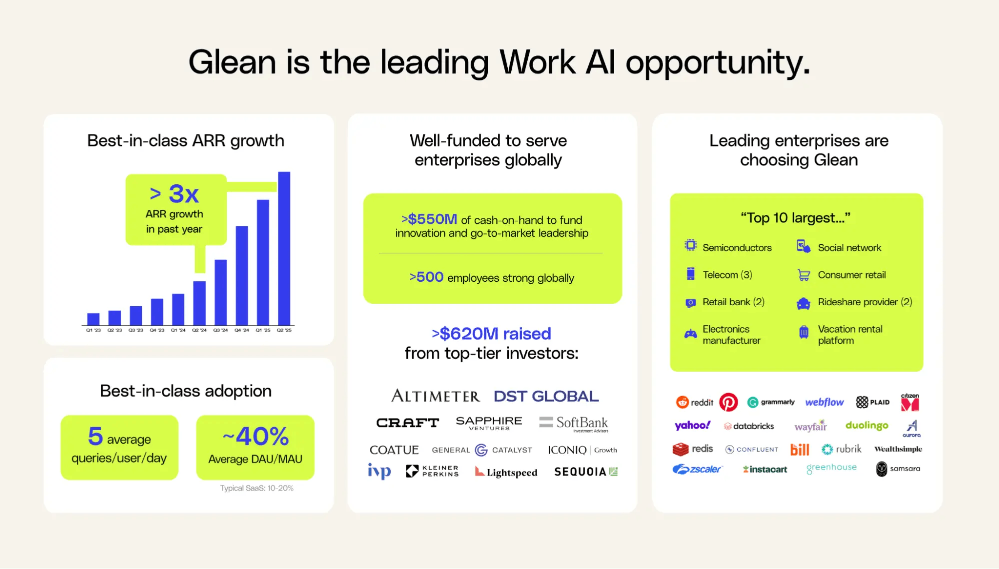 User engagement as of September 2024 has been strong across Glean's customer base, with an average daily active user (DAU) to monthly active user (MAU) ratio of ~40%, well above the 10-20% typical for enterprise SaaS platforms. Glean Assistant, in particular, has seen rapid adoption, with users querying the tool an average of five times per day — comparable to Google search activity. Many customers have cited Glean Assistant as the first new tool in years to be added to their everyday tech stack for work, joining core systems like Slack, Teams, email, and calendar tools.