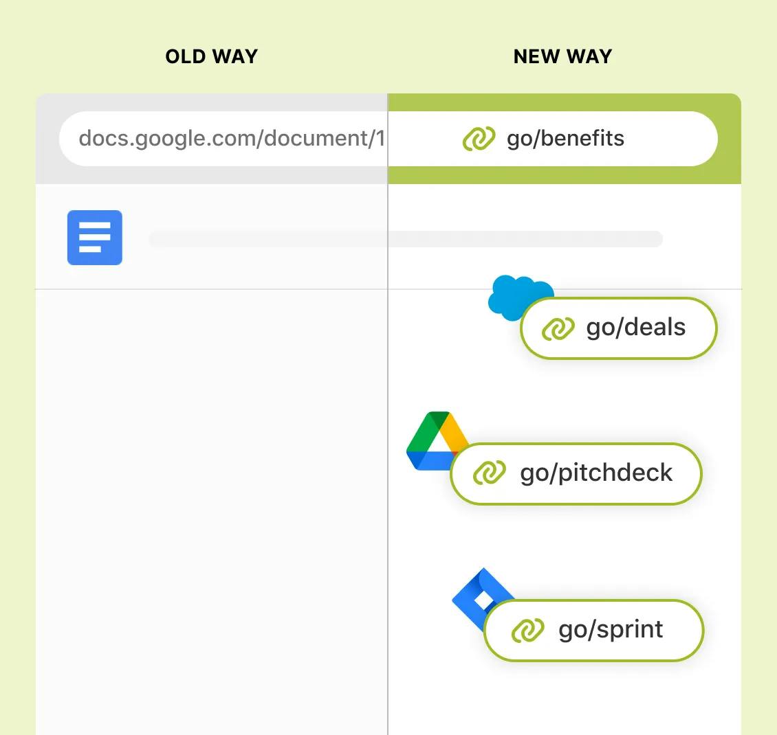 To further streamline a user’s ability to access a document collection, users can create and share Go Links to help employees quickly navigate to common collections of resources. For example, a company can create the Go Link “go/pitchdeck to arrive on a Google Slides deck within Google Drive. Alternatively, the Go Link “go/deals” could be created that directs users to Salesforce.