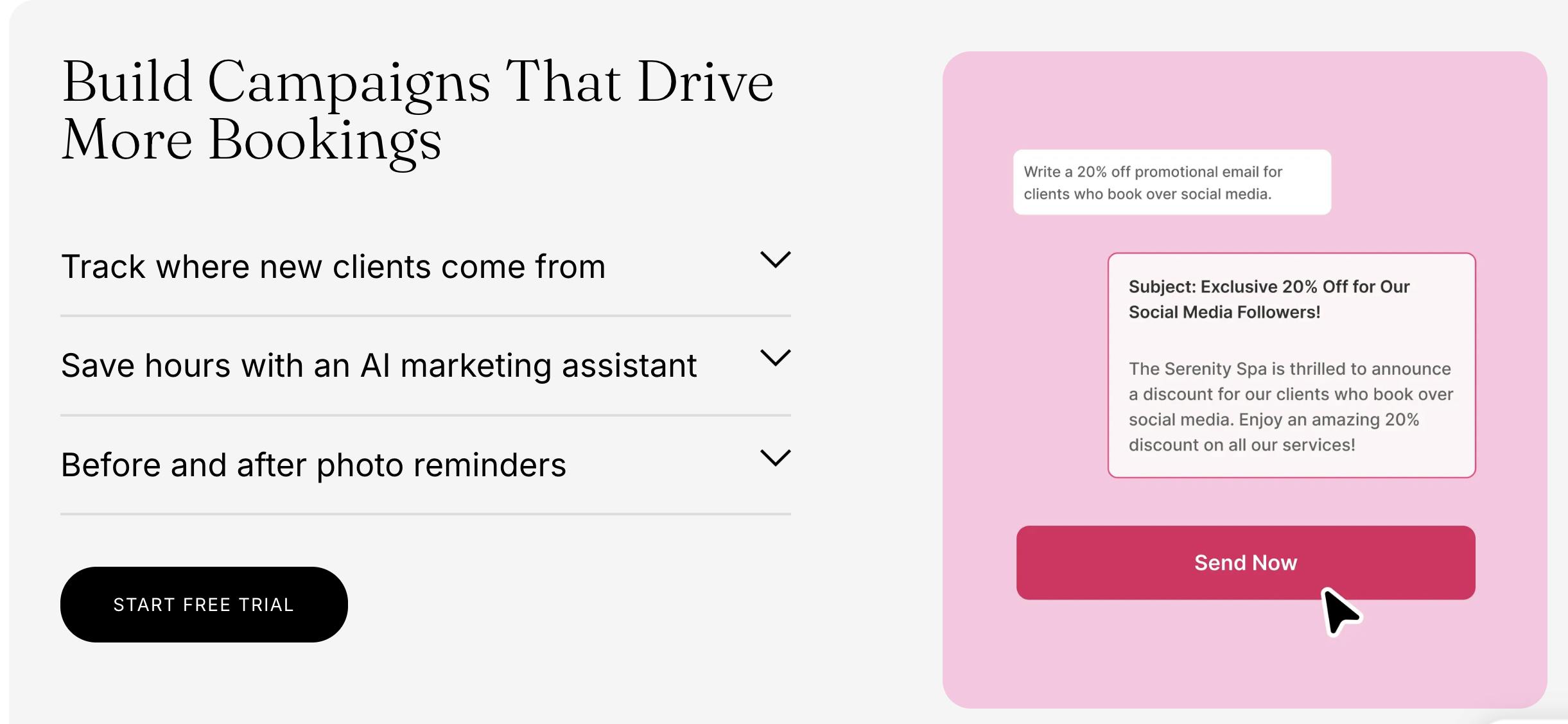 Marketing: GlossGenius provides unlimited email campaigns and SMS Blasts that can be segmented by visit history, service type, or client spending. It includes pre-built campaign templates with drag-and-drop email builders and has an AI marketing assistant that helps business owners write personalized campaigns from AI prompts.