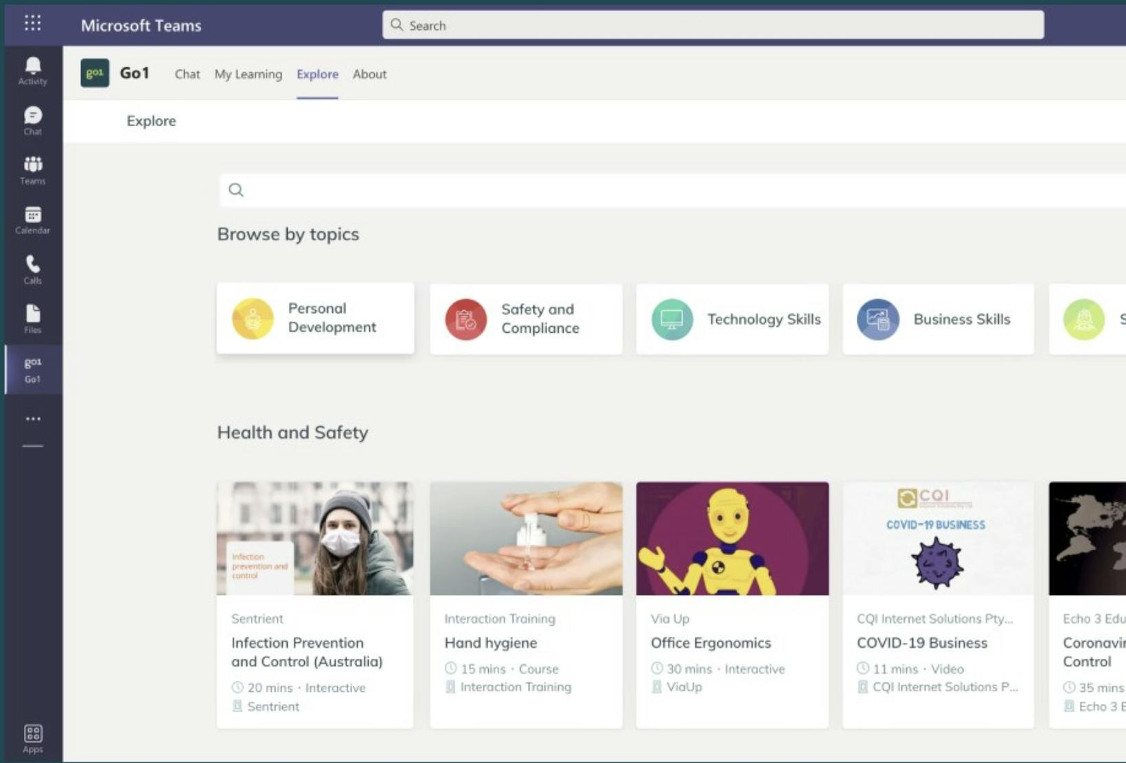Specific platforms, such as Microsoft Teams, provide the option to download the Go1 App or access Go1 directly through the Microsoft Teams platform. For example, the Go1 for Microsoft Teams allows team owners to create “Learning Tabs” within specific Teams channels and add Go1 content directly to the channel. Users can even access and share learning content within Teams video calls.