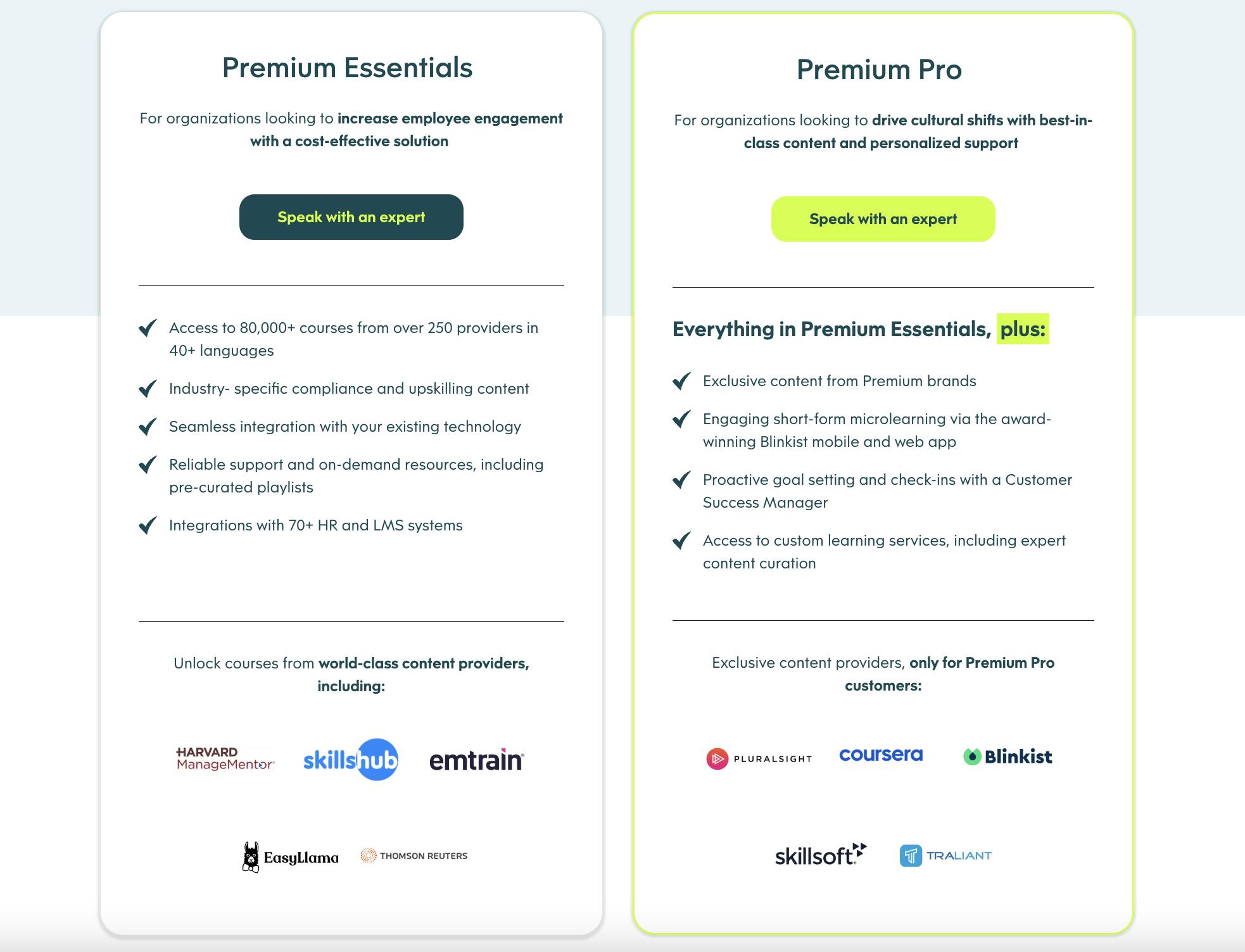 There are two versions of Go1 Premium: Premium Essentials and Premium Pro. Premium Essentials includes access to all the learning content and pre-curated playlists available on Go1 as well as integration capabilities with 70+ platforms that may already be in use by an organization. Premium Pro includes everything offered in the Premium Essentials subscription as well as exclusive content from premium brands, short-form microlearning offered by the mobile app Blinkist, connection to a Customer Success Manager, and access to other custom learning services such as expert content creation.