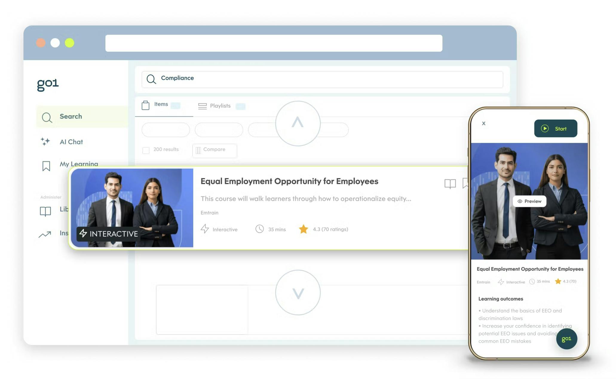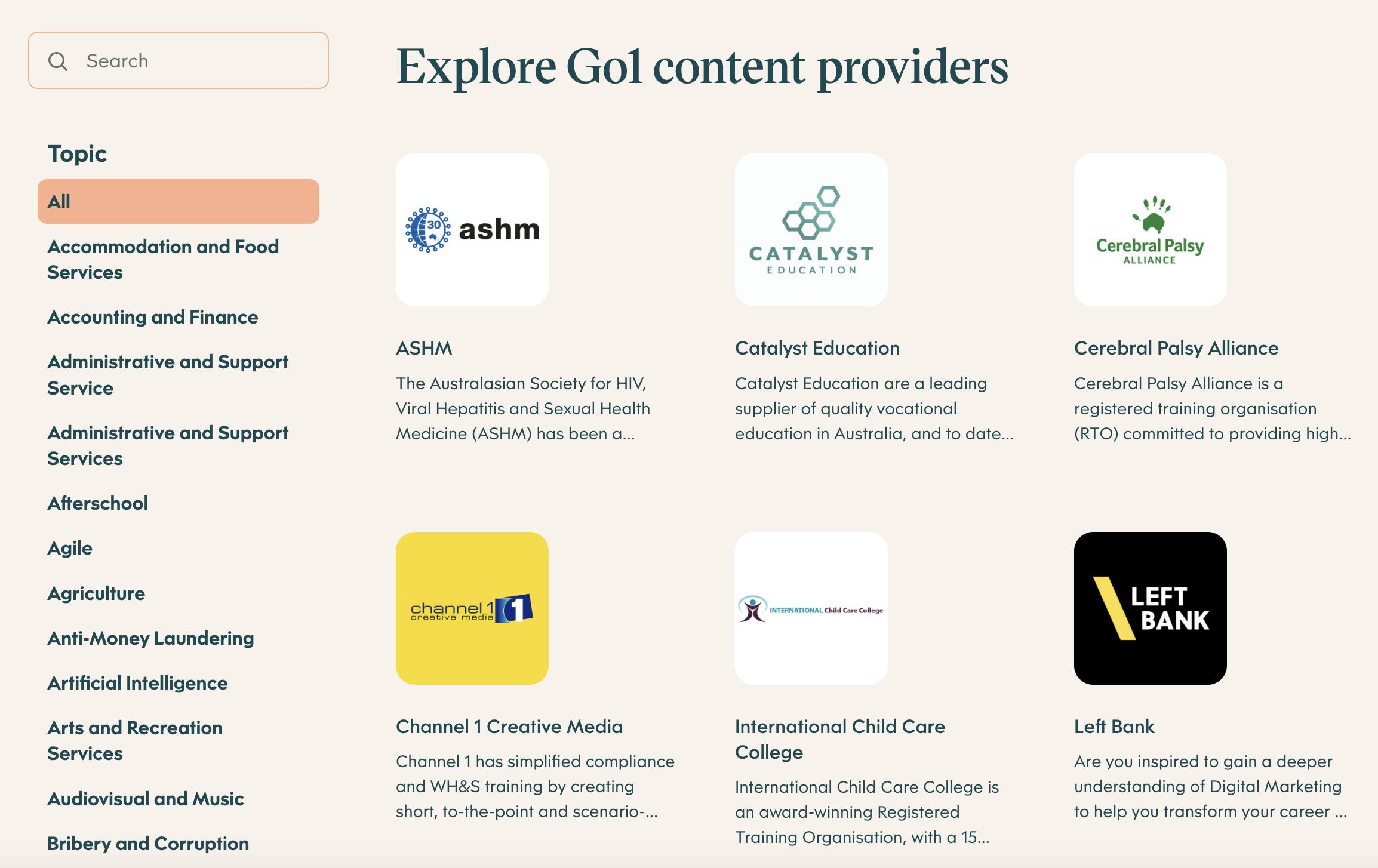 Go1’s content library includes training from third-party providers across a wide variety of topics. Rather than having to negotiate with a number of content providers across different disciplines, customers can gain access to an entire library through Go1.