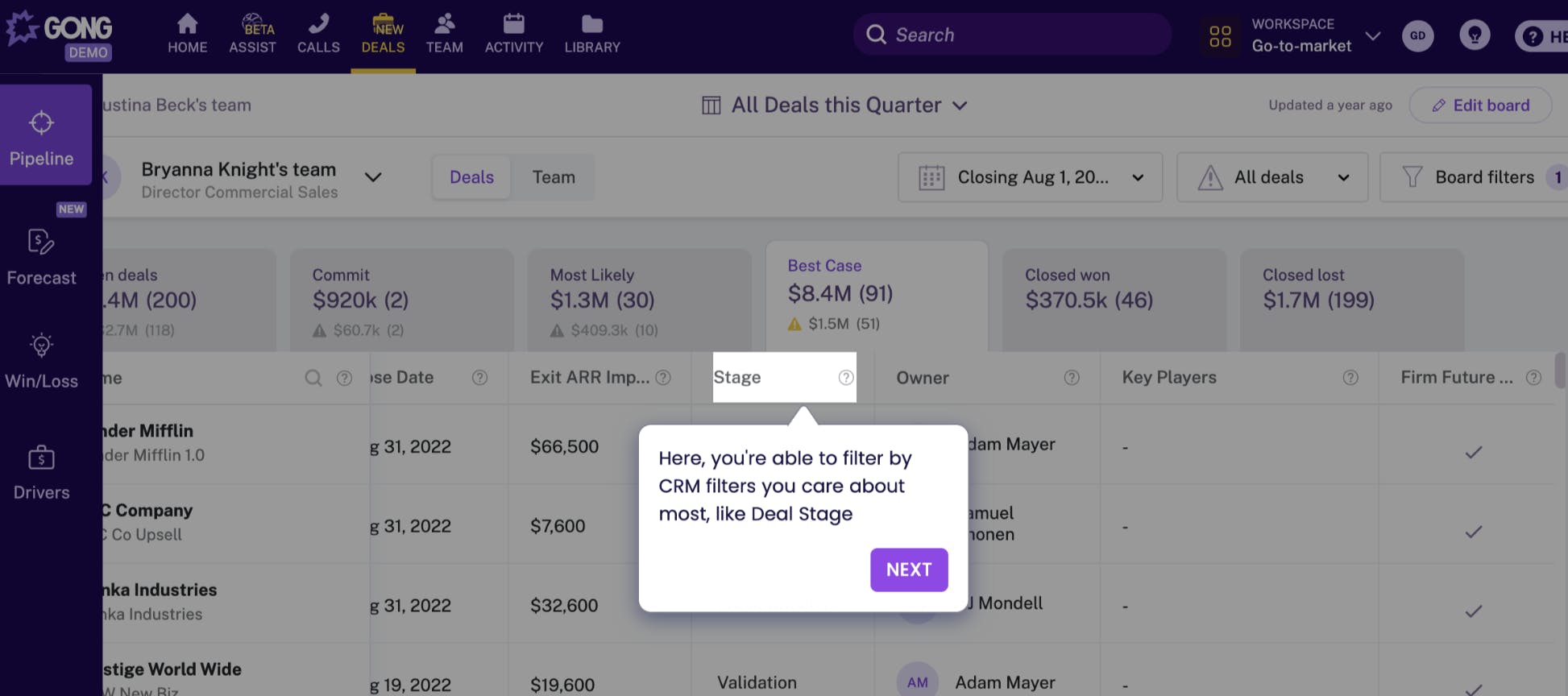 Gong captures conversations from video calls to phone calls, emails, and more — anywhere salespeople interact with customers or prospects. It allows users to toggle between multiple views of the company sales pipeline. This data originates from CRMs like Salesforce or Hubspot and is brought into Gong’s platform with partner integration.