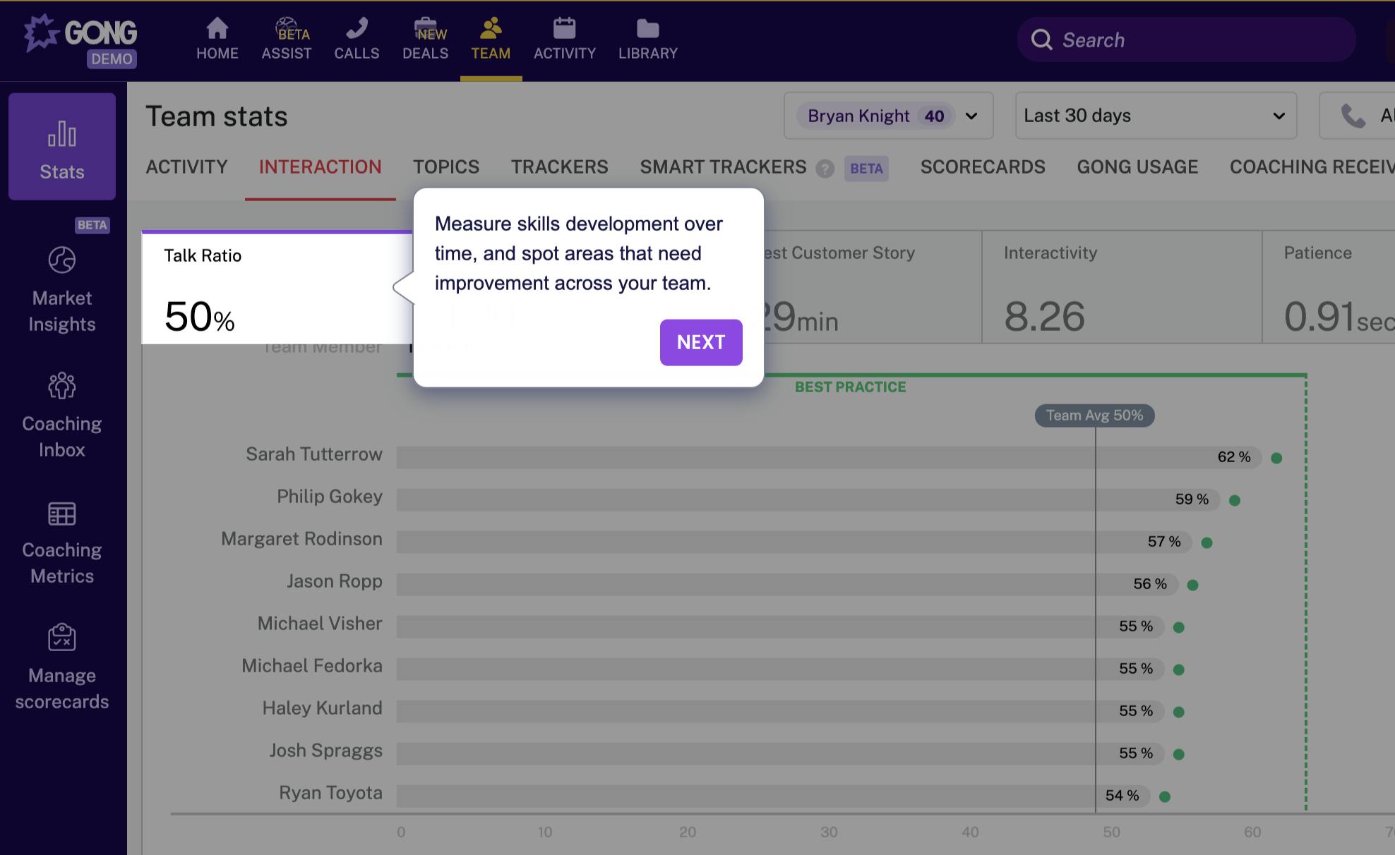 After ingesting calls and emails, Gong is able to measure and help sales teams optimize how they sell and parse spoken and written keywords to enable salespeople to quantify points of interest such as questions, keywords, and smart trackers. Teams can listen to each others’ recorded calls and annotate calls, enabling sales reps to have performance feedback integrated into a single place for current and future customer touchpoints. Users are given metrics such as talk time and monologue time to reference, and leadership is then able to track feedback across their teams.