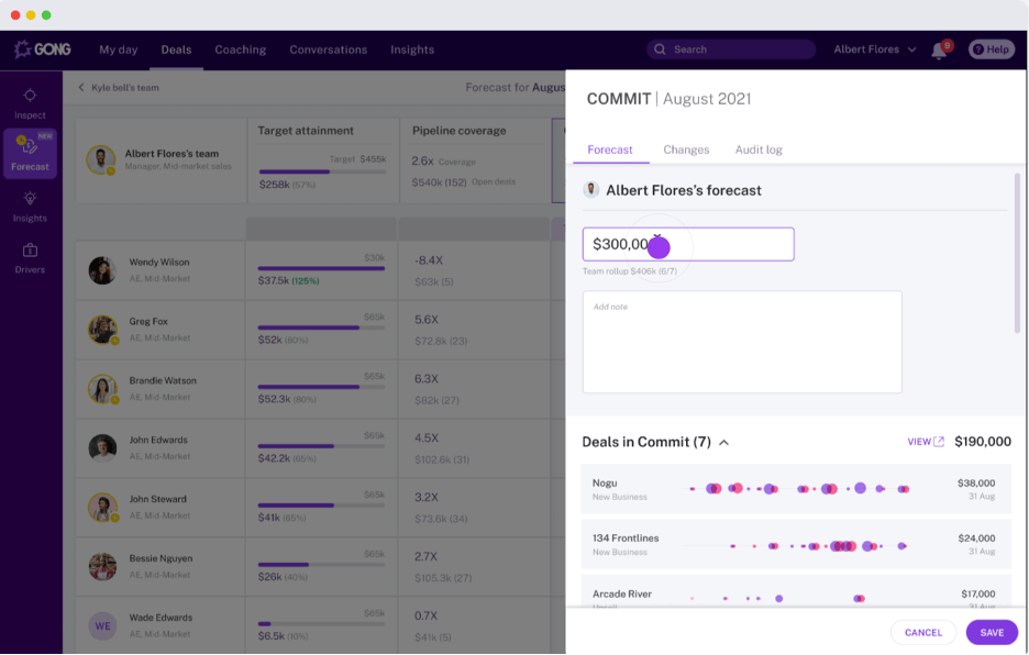 Forecasting gives teams visibility into their pipeline in order to deliver revenue predictability. It enables sales leadership to track deals for each team member, with an interface for users to update forecasts in real time based on sentiment tracked through the company’s NLP tech.
