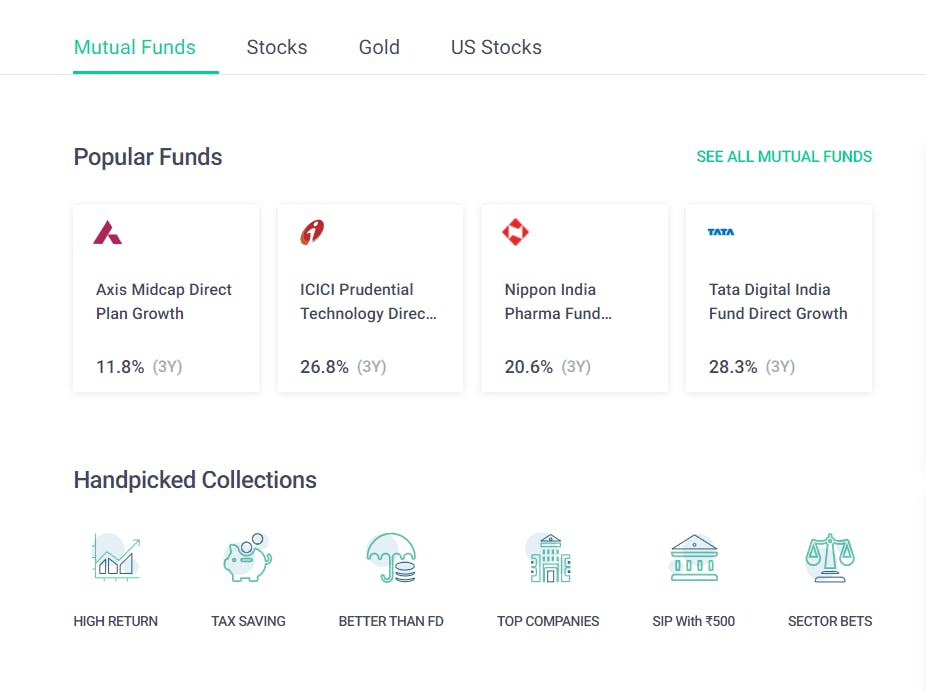 Mutual Funds: Groww’s mutual fund offerings can include (1) Direct Fund / Direct Plan, which lets users purchase directly from the mutual fund company, instead of a regular plan which is bought through an advisor or broker, (2) Smart Save, which lets users store idle money, earn higher interest rates compared to a regular savings account, and withdraw quickly, (3) New Fund Offerings, which is a subscription offering for any new fund being launched by an investment company, and (4)Track and Compare, which services that allows comparison of mutual funds along parameters like Net Asset Value (NAV), risk, rating, etc. and tracking returns on current investments.