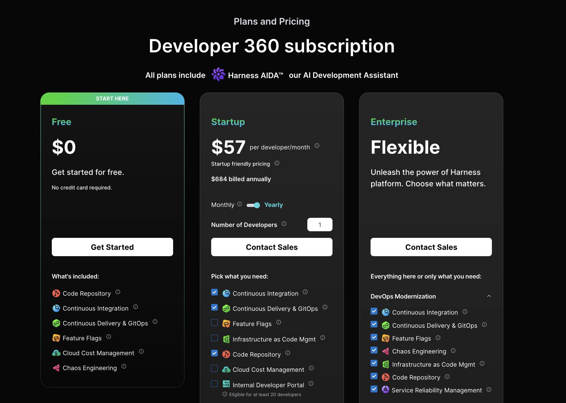 Harness offers three pricing tiers: free, startup, and enterprise.
