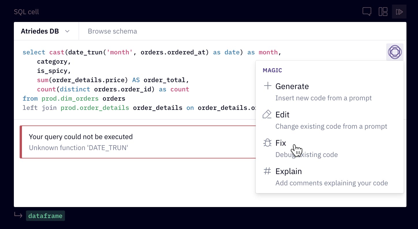 In February 2023, Hex announced the private beta of Hex Magic, a generative AI assist tool. With Magic, Hex is able to understand and use a schema’s end tables to build queries. Current features include auto-querying, debugging, and code explanations. However, Hex affirms that this offering does not equate to “instant insights in a box.” While AI capabilities are great, they cannot replace human insight and judgment. AI can help alleviate tedious tasks, but it does not yet fully understand business context, know the right questions to ask, or how to present cohesive answers.