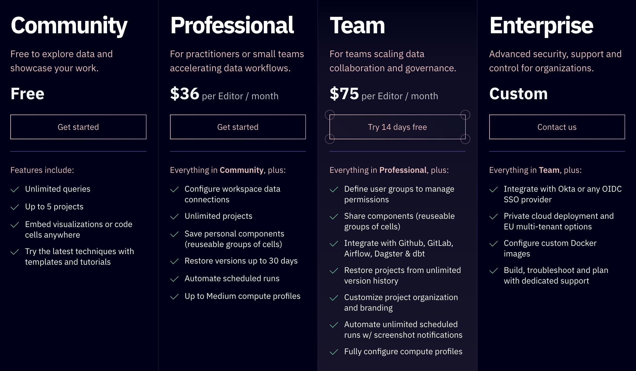 Team: $75 per Editor per month for larger teams scaling data collaboration and governance.