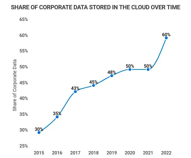 In addition, adoption of cloud data warehouses has grown sharply in the decade leading up to 2023. From 2015 to 2022, the share of corporate data stored in the cloud grew from 30% to 60%, respectively. Cloud infrastructure spend grew to $90 billion in 2022 (22% YoY growth from 2021), representing the highest annual growth rate since 2018. With the rapid growth of cloud data platforms coupled with the proliferation of ETL and data maintenance tools, it’s becoming easier than ever to adopt and maintain a cloud data warehouse.