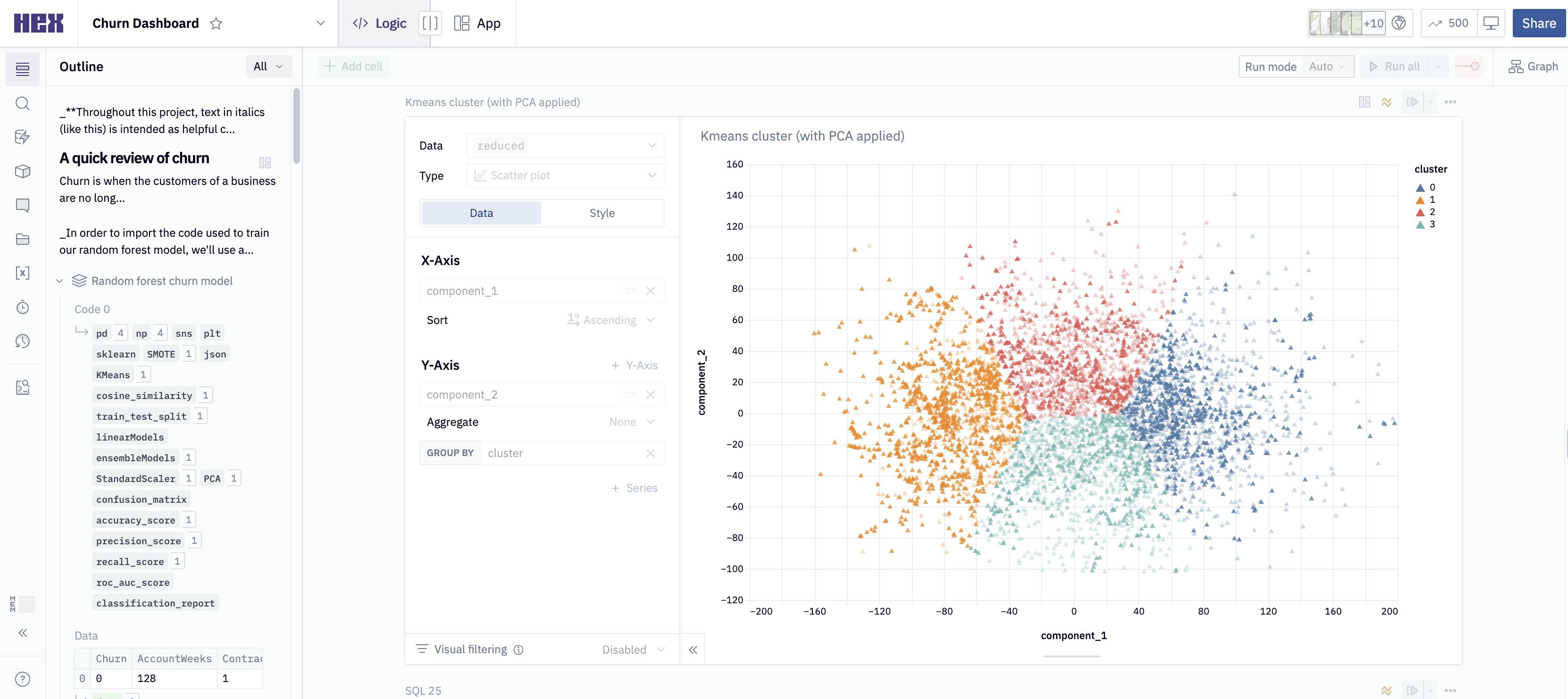 Customer Churn Dashboard: This feature lets users build an interactive frontend for any ML model using Hex. Users can use a rich library of cells to accept user input, create visualizations, or take actions based on model outputs.