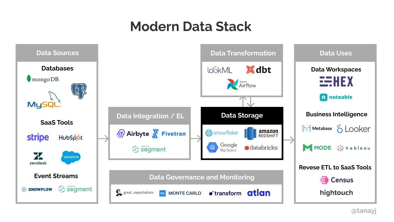 Data storage, which includes cloud-based data warehouse solutions like Snowflake, Redshift or BigQuery, to store data.