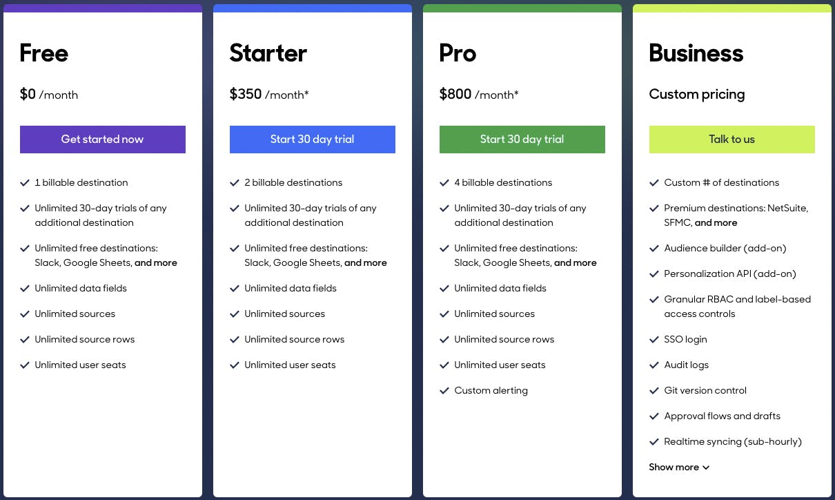 Hightouch is a SaaS product with a usage-based pricing model based on the number of destinations. It can be purchased as a self-service offering, but Hightouch also offers a sales team which works with large organizations which require deeper usage and integration. It offers tiered subscriptions including a free subscription, starter subscription ($350/month), pro subscription ($800/ month), and business subscription with custom pricing.