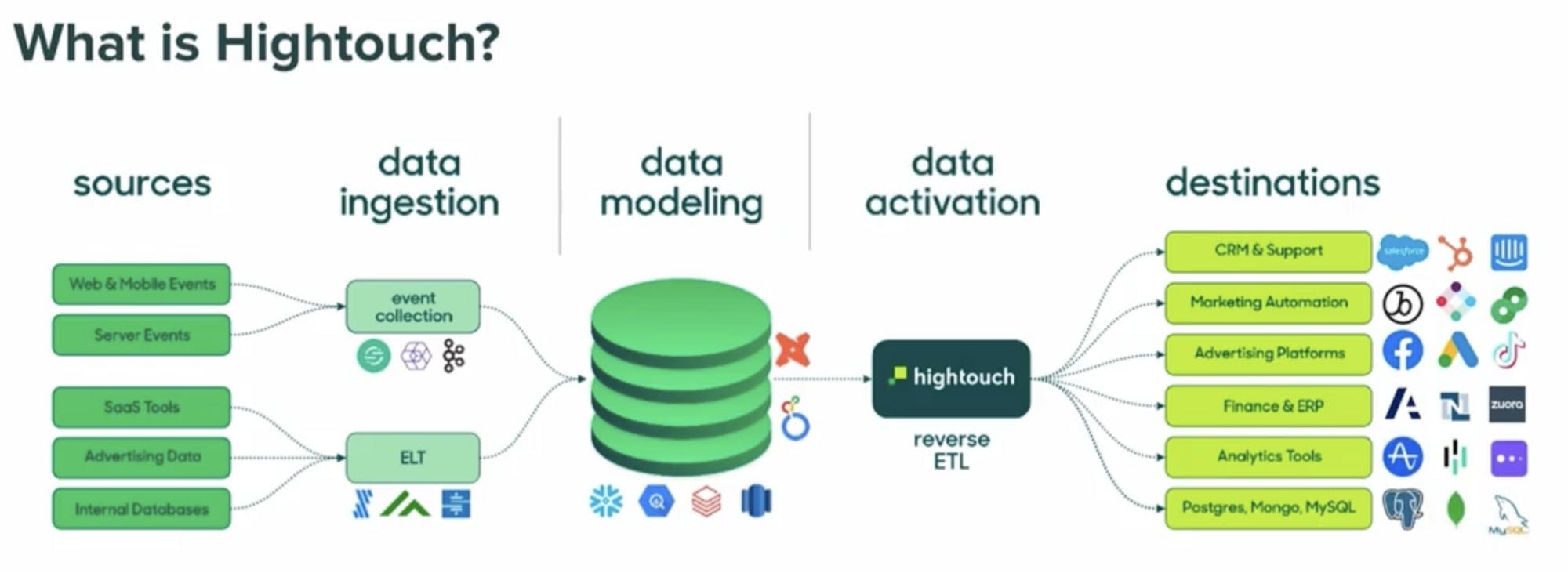 Hightouch offers 4 primary products: (1) a reverse ETL, (2) a customer studio, (3) a personalisation API and (4) a business notifications platform.