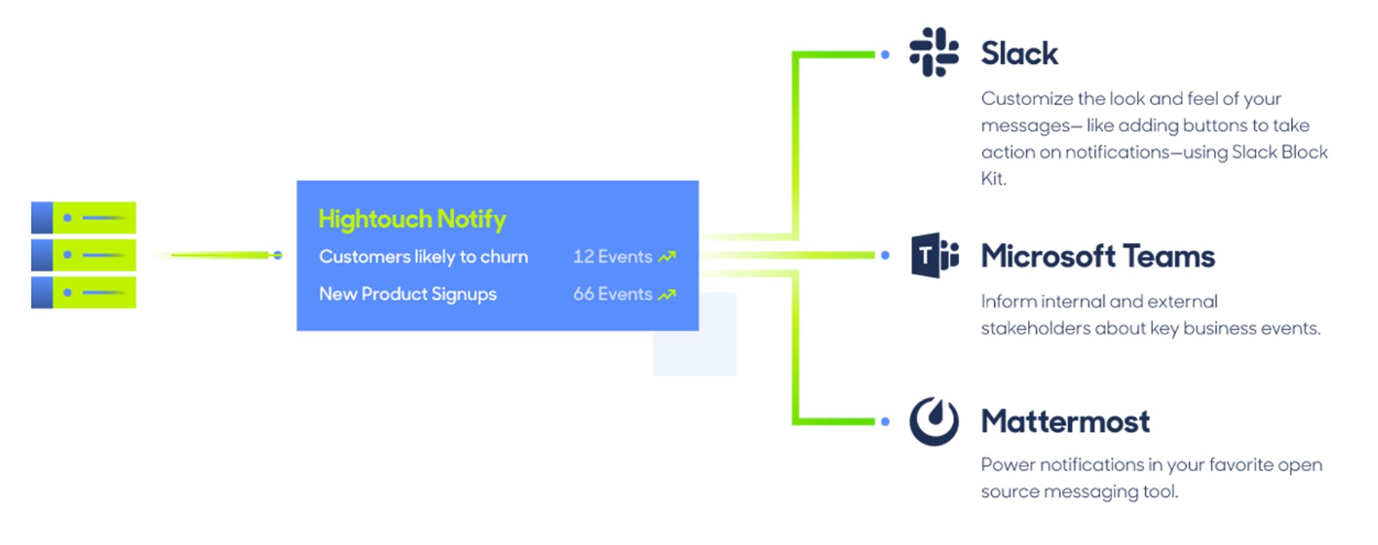 The business notifications platform is used by operation teams to push business events — such as an upsell opportunity, or a customer likely to churn — into messaging platforms like Slack and Teams. Operations teams can build these workflows autonomously from both tech and data teams. This allows business teams to receive critical, data-driven notifications without leaving the communications apps they use on a daily basis.