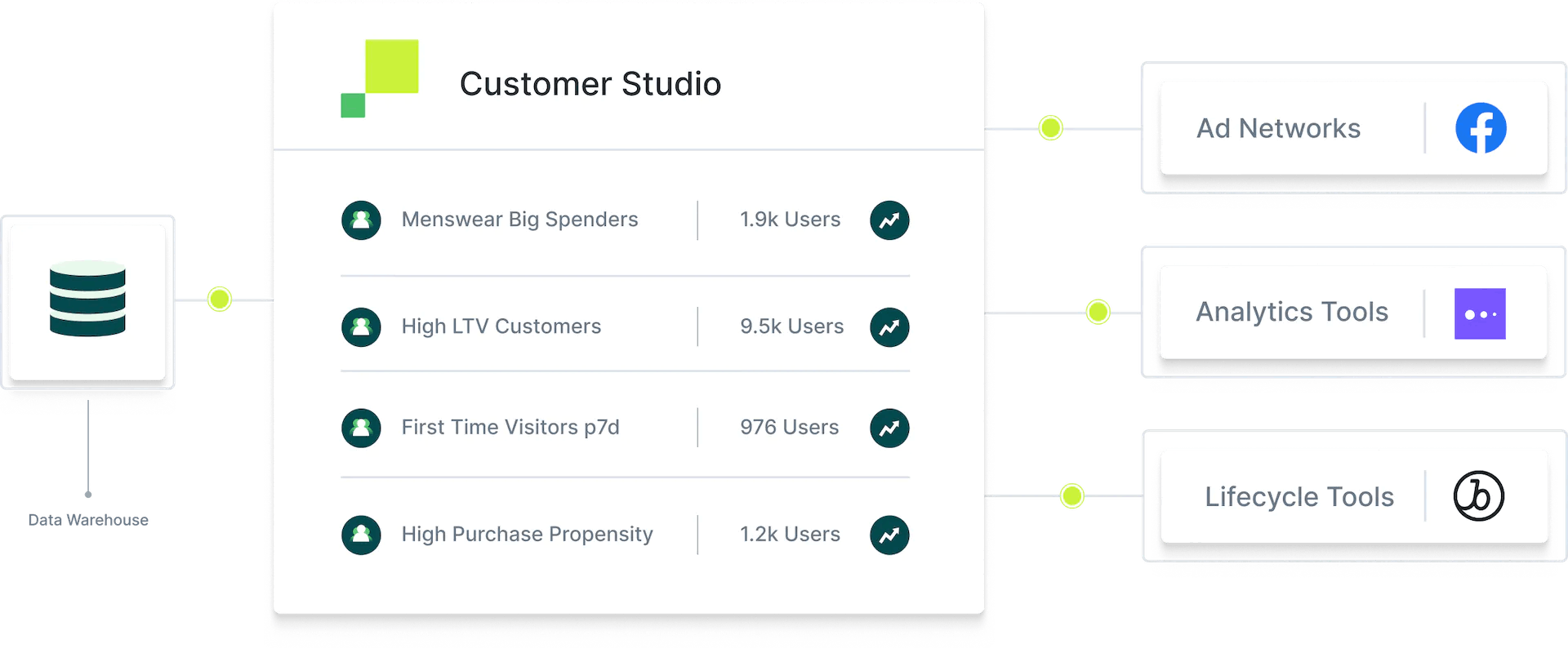 Synchronize customer data to the marketing tools they use across different functions like advertising (Google Ads, Facebook Ads, Amazon Ads, Linkedin Ads, Snapchat, TikTok, Twitter), SMS & push notifications (Braze, Attentive, Customer.io, Klaviyo), CRMs (Salesforce, Kustomer) or email (Mailchimp, Marketo, Salesforce Marketing Cloud).