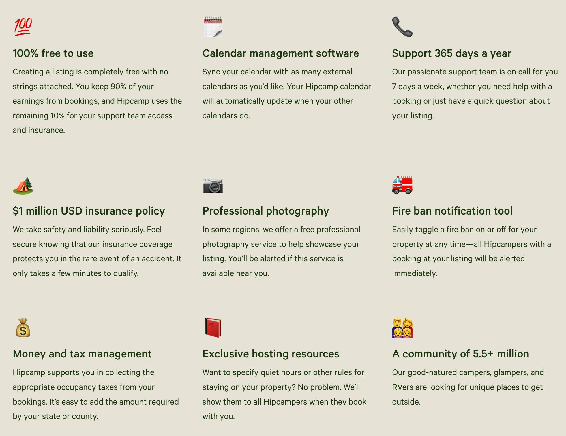 Hipcamp advises its hosts to price their listings at a comparable rate to similar sites in their local state park. These can range from $35 for a campsite with few amenities to $300 for group campsites with private lakes. It also developed a feature called “Extras” which enables hosts to sell experiential add-ons, such as equipment rentals, food, and firewood. Hipcamp’s insurance protects the Hosts for up to $1 million for general liability claims per occurrence on every booking.