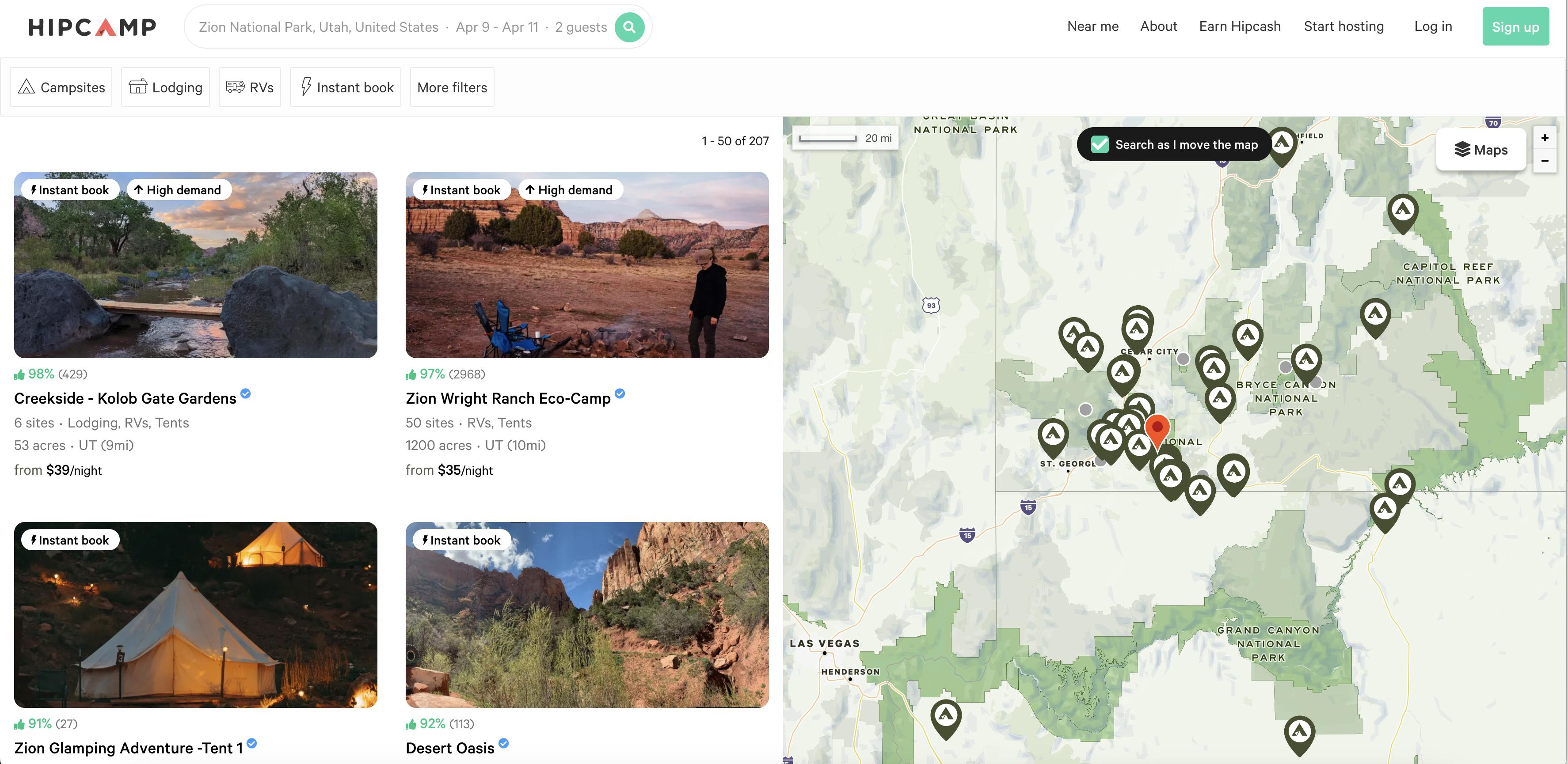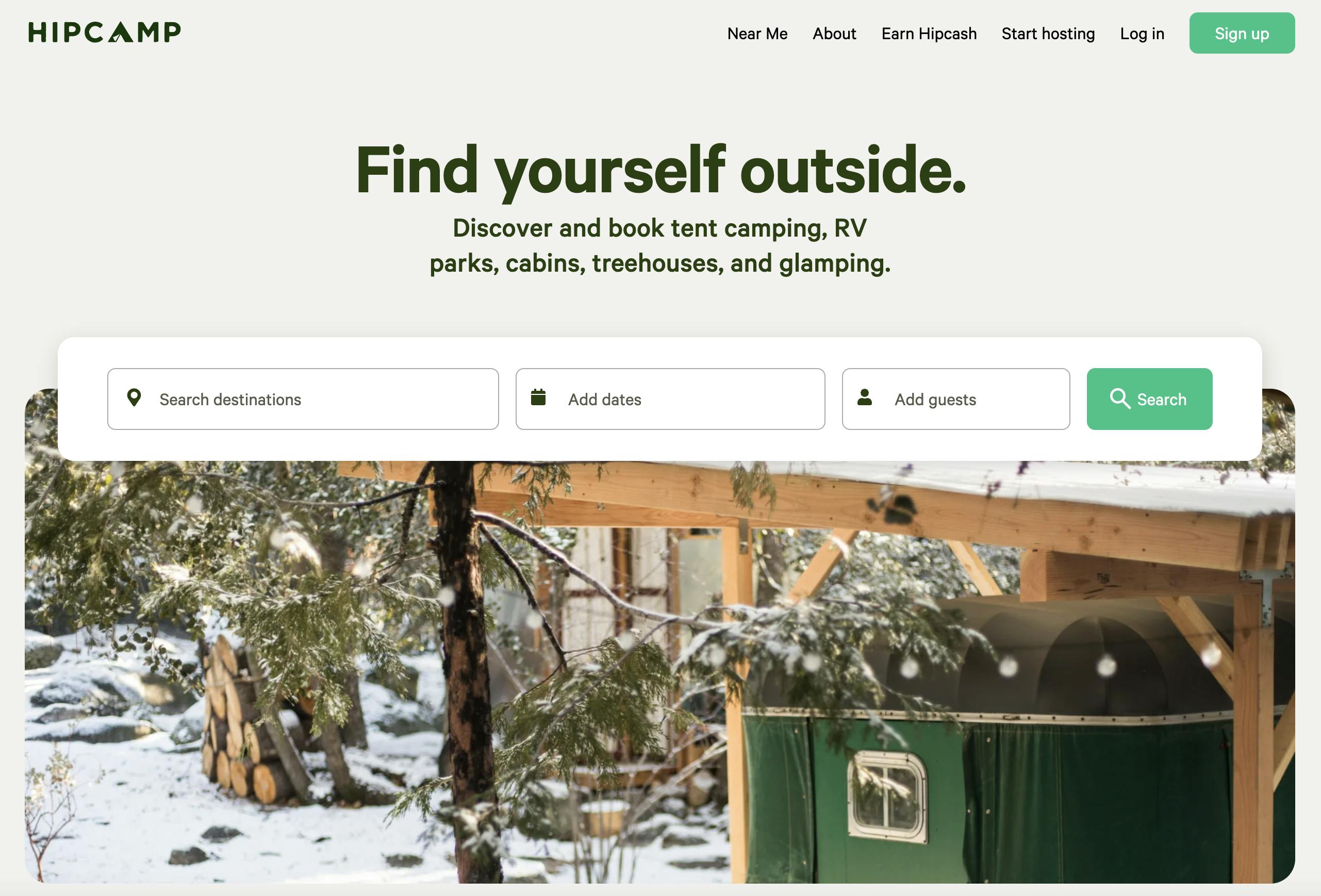 Hipcamp facilitates stays across camping, glamping, RVs, cabins, yurts, and more. It also curates and organizes stays by location, park, season, timeline, and other variables.