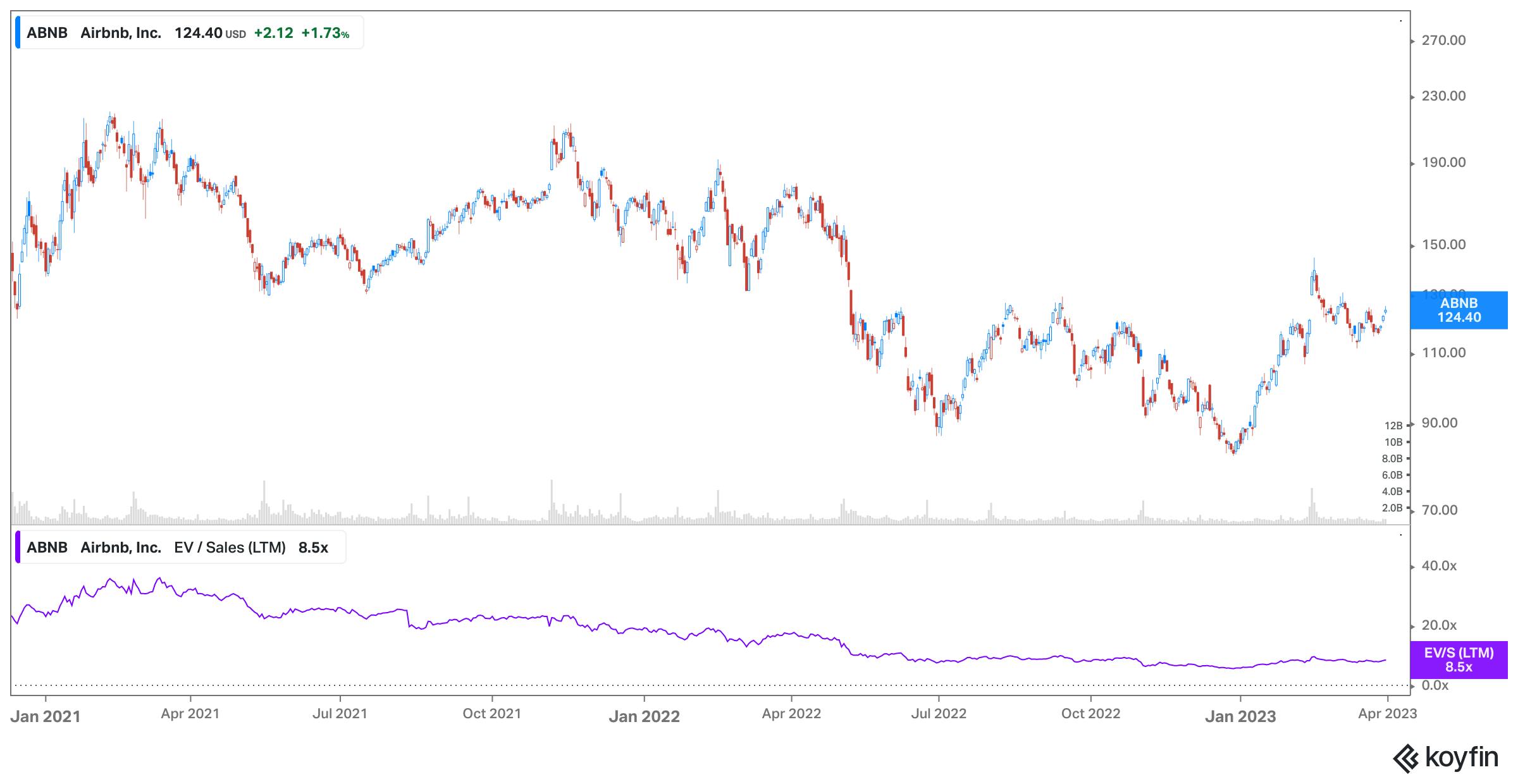 For comparison to publicly-traded companies, Airbnb has seen its stock perform well through the first quarter of 2023, though it is down significantly from its post-IPO highs in 2021. As of April 2023, It trades at an 8.5x revenue multiple, down significantly from its highs.